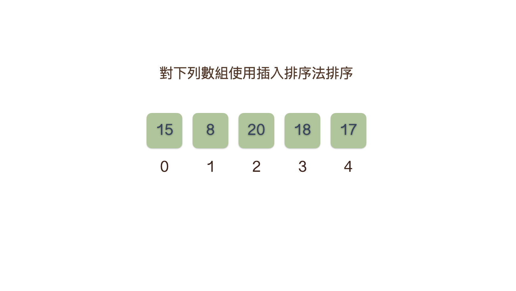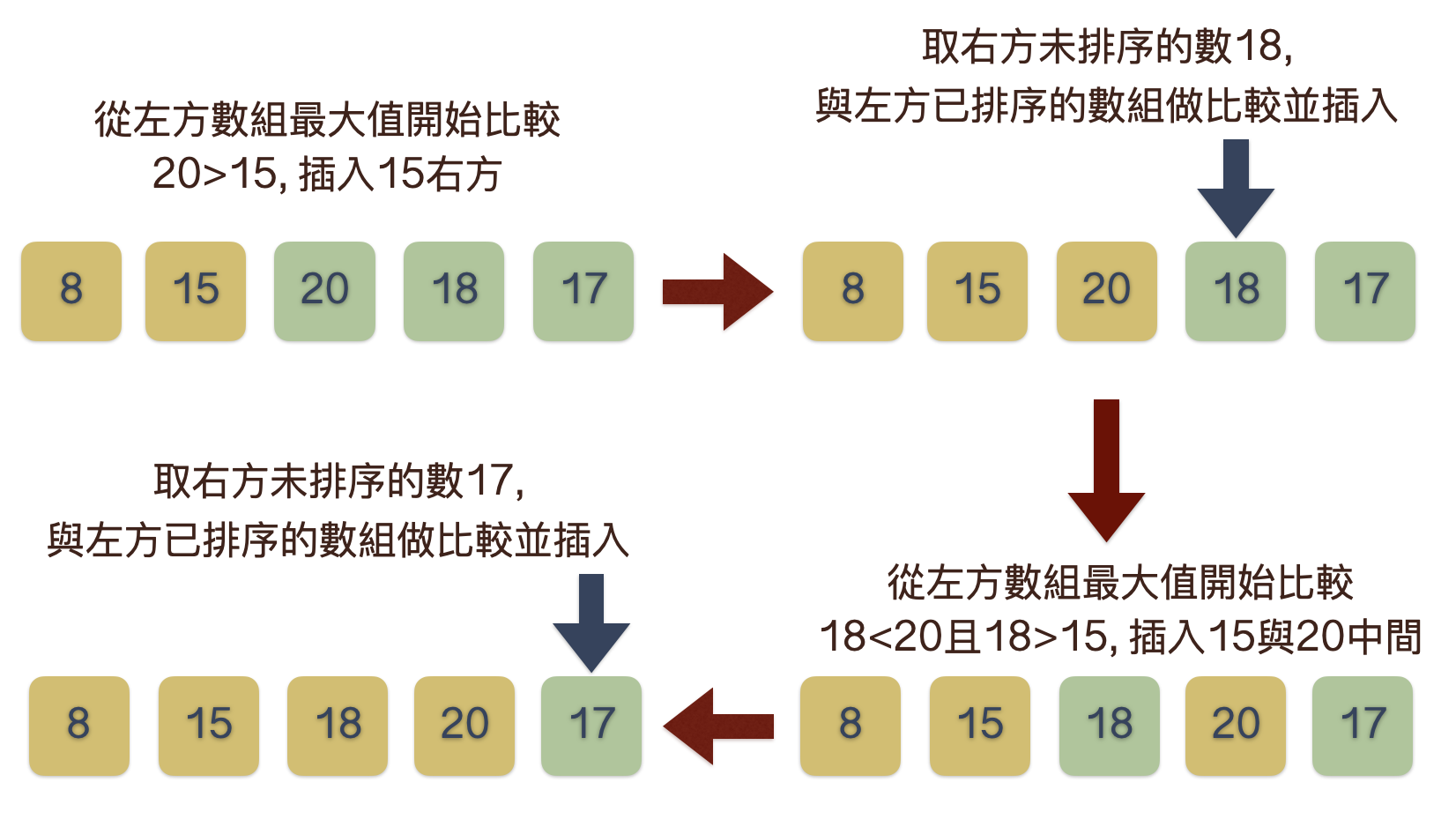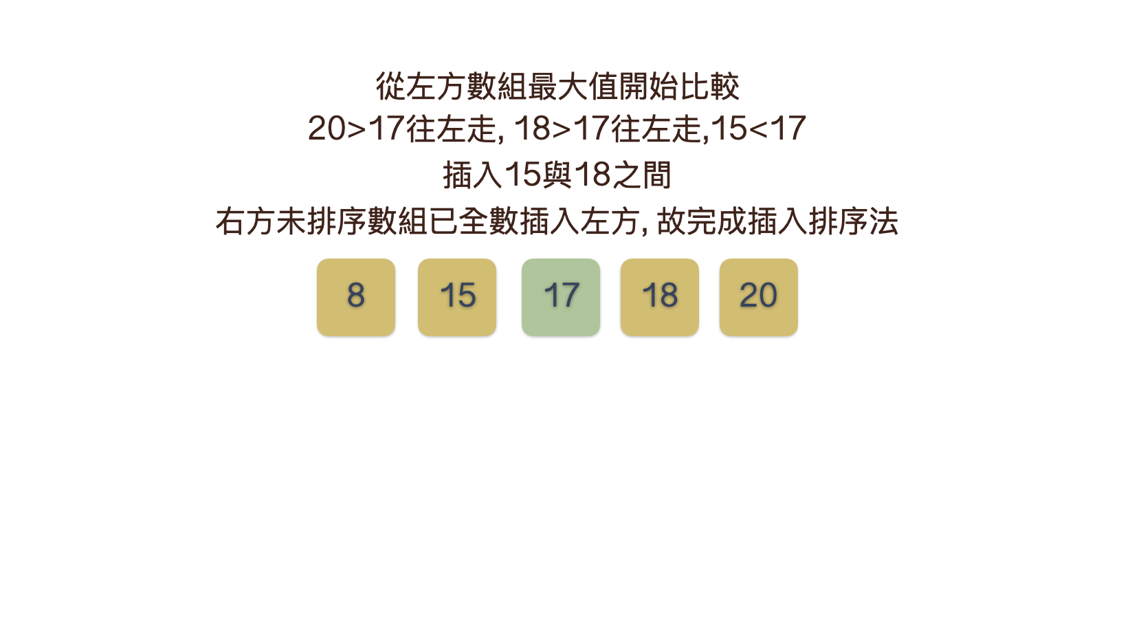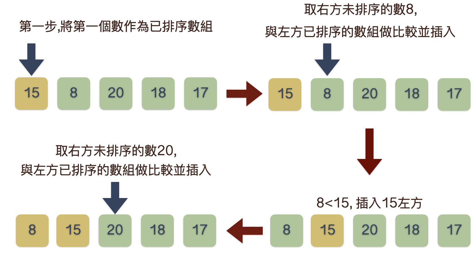 - 首先取第一個數字作為已排序的數組, 再逐一取右邊待排序數組中的一個數從左方數組後方一個一個判斷插入左邊數組中