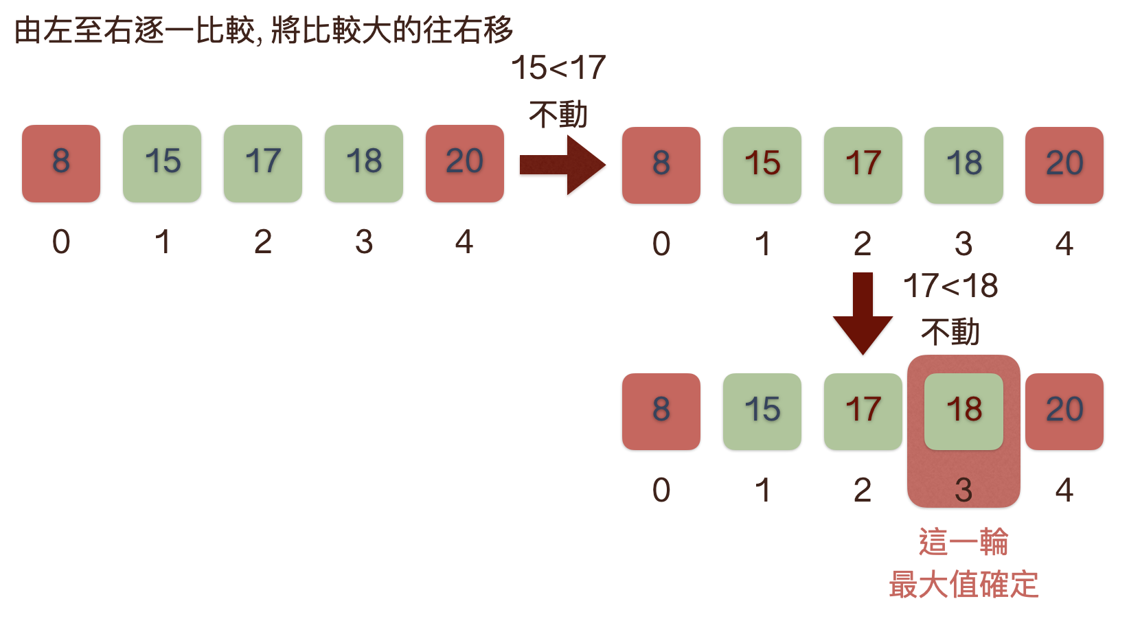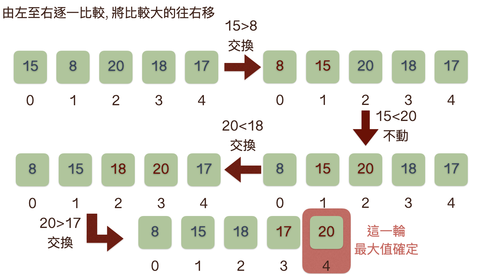 - 第一輪由左至右逐一比較, 將最大的值往右邊移