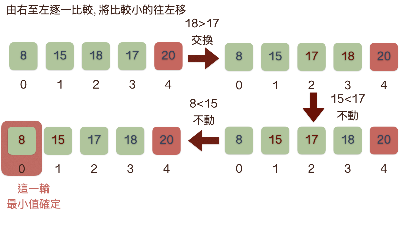 - 第二輪去除第一輪的最大值, 由右至左逐一比較, 將最小的值往左邊移