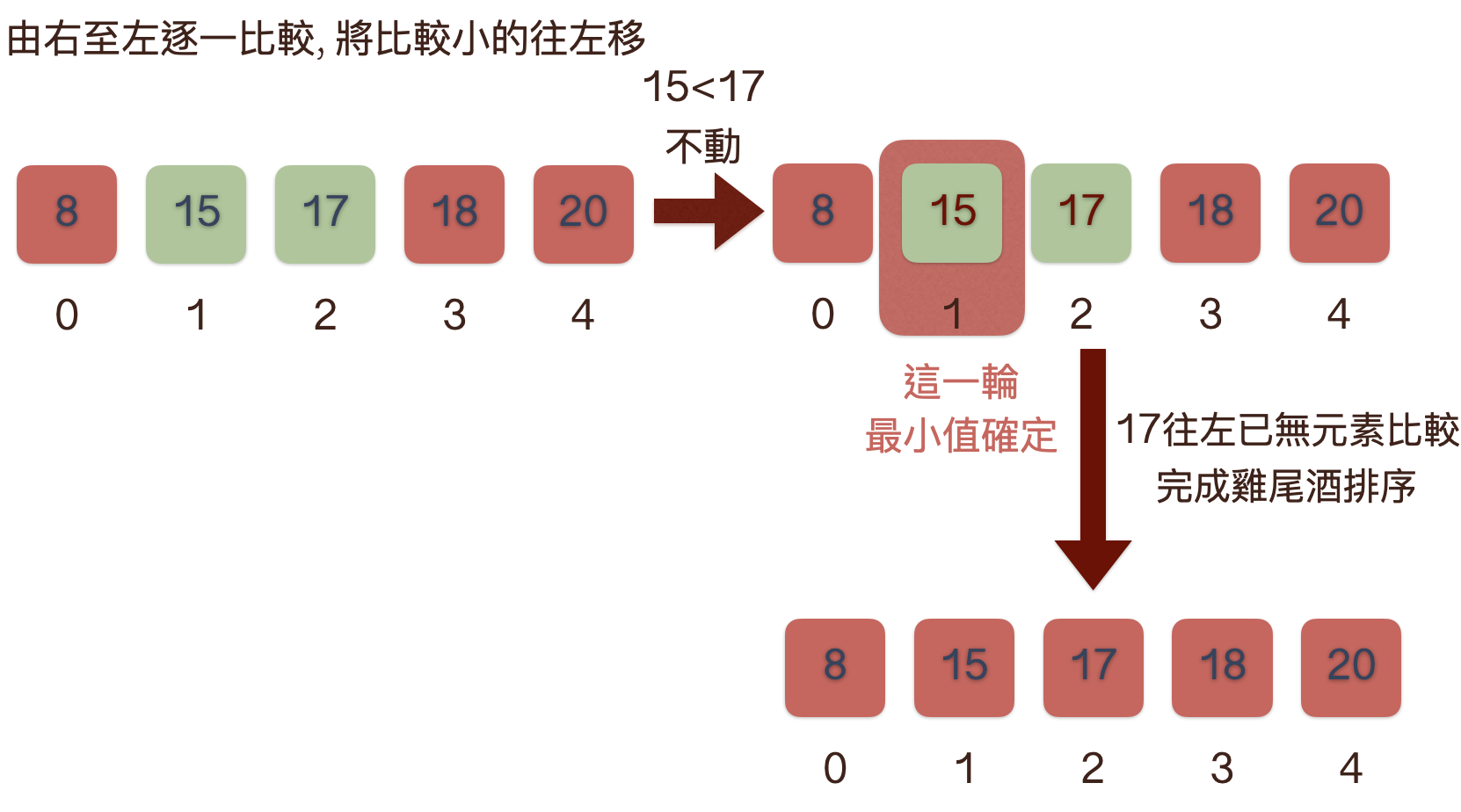 - 第四輪去除第一輪的最大值與第二輪最小值與第三輪最大值, 由右至左逐一比較, 將最小的值往右邊移