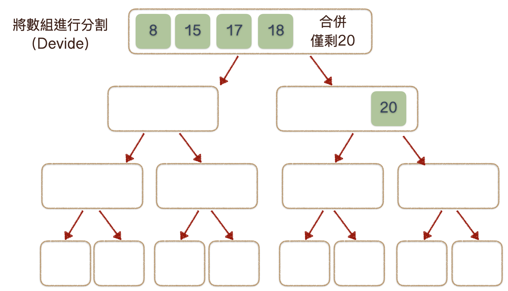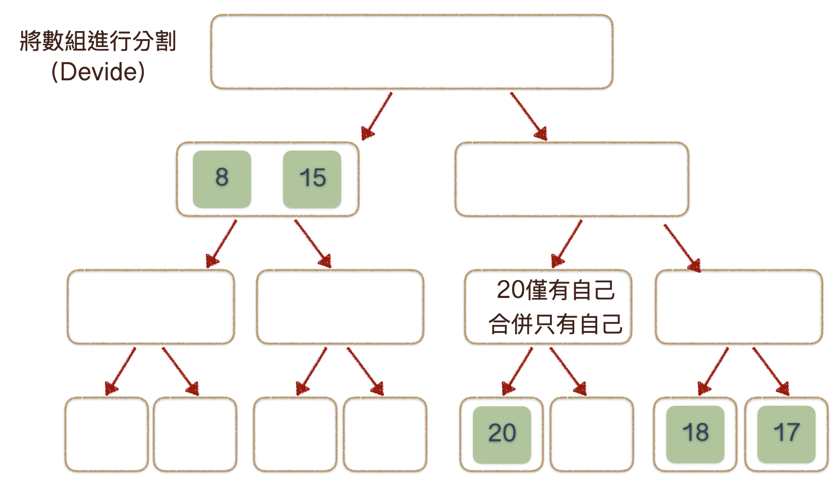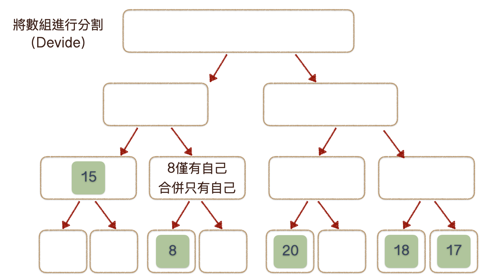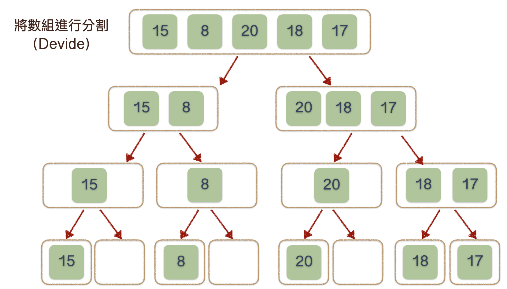 - 先將預排序數怎進行分割, 直到分割至最小單位後再逐一合併