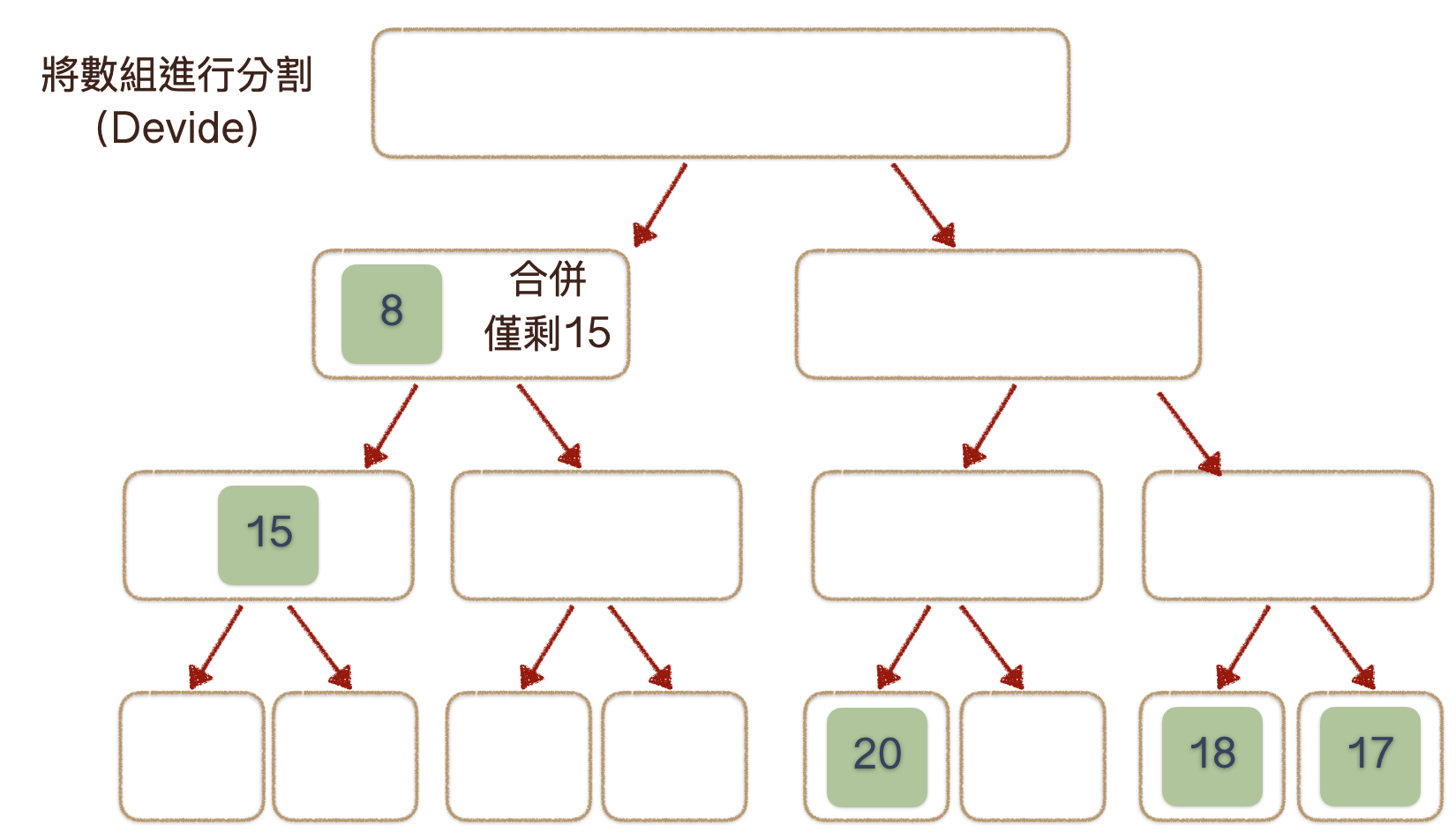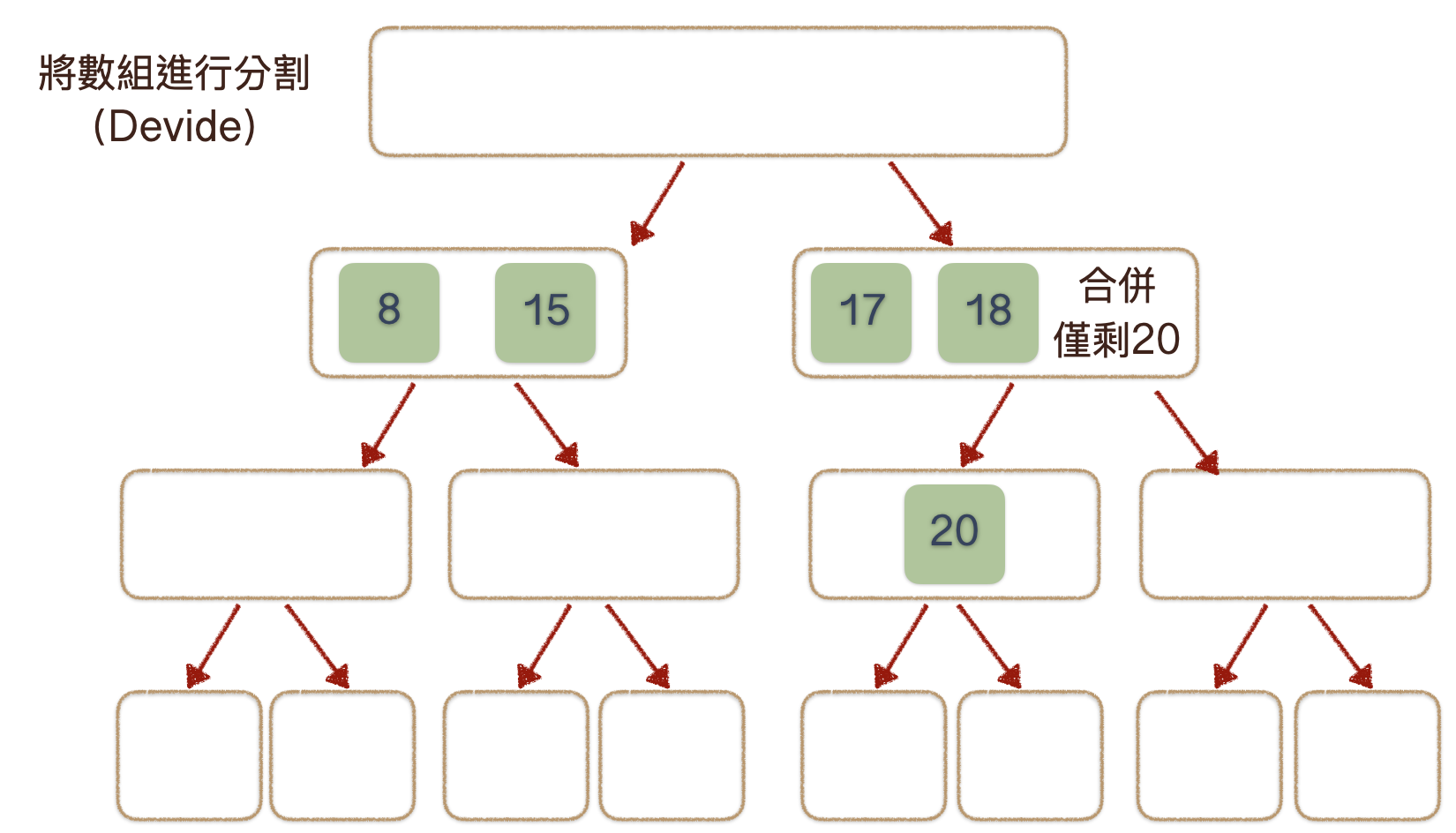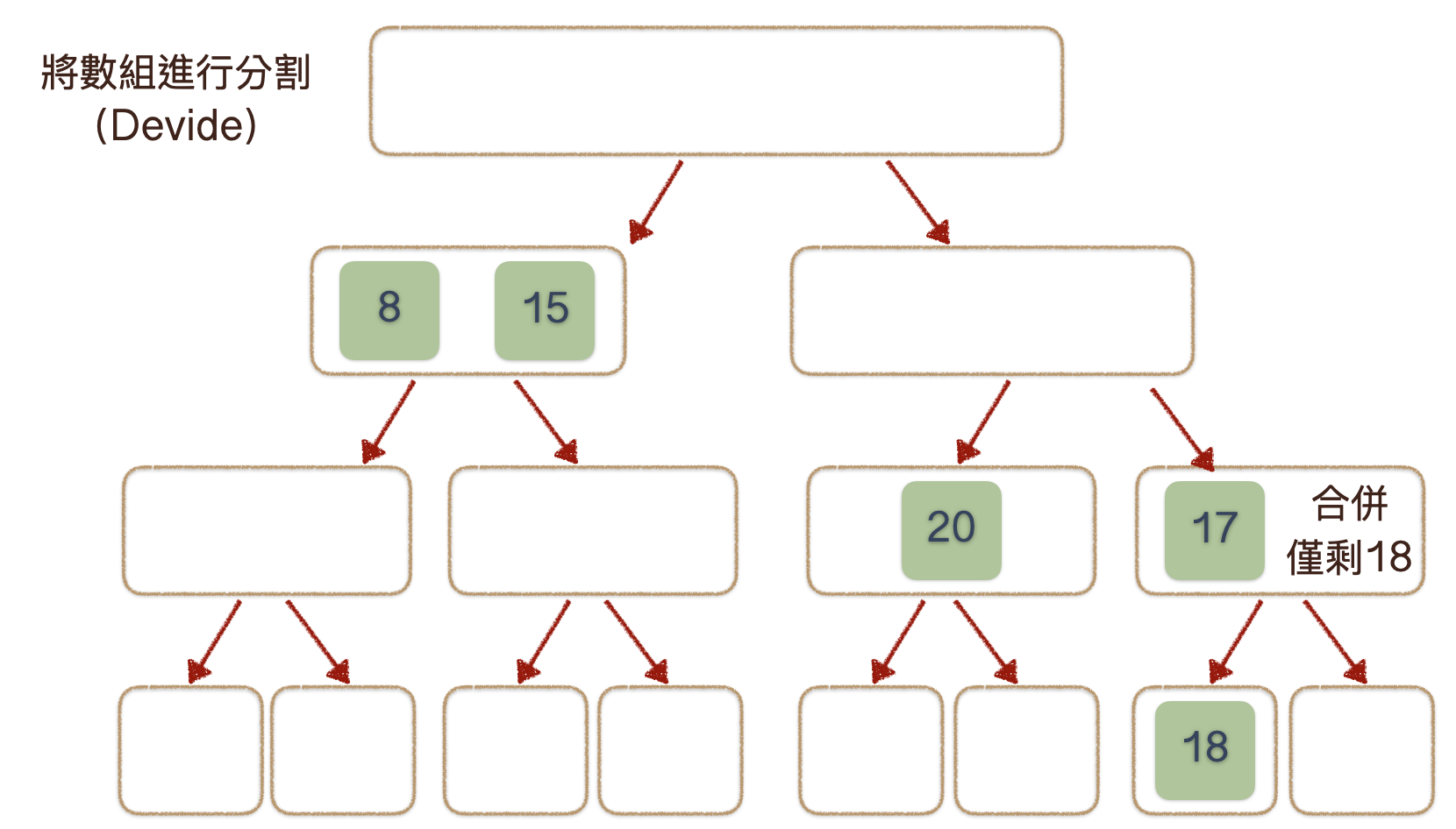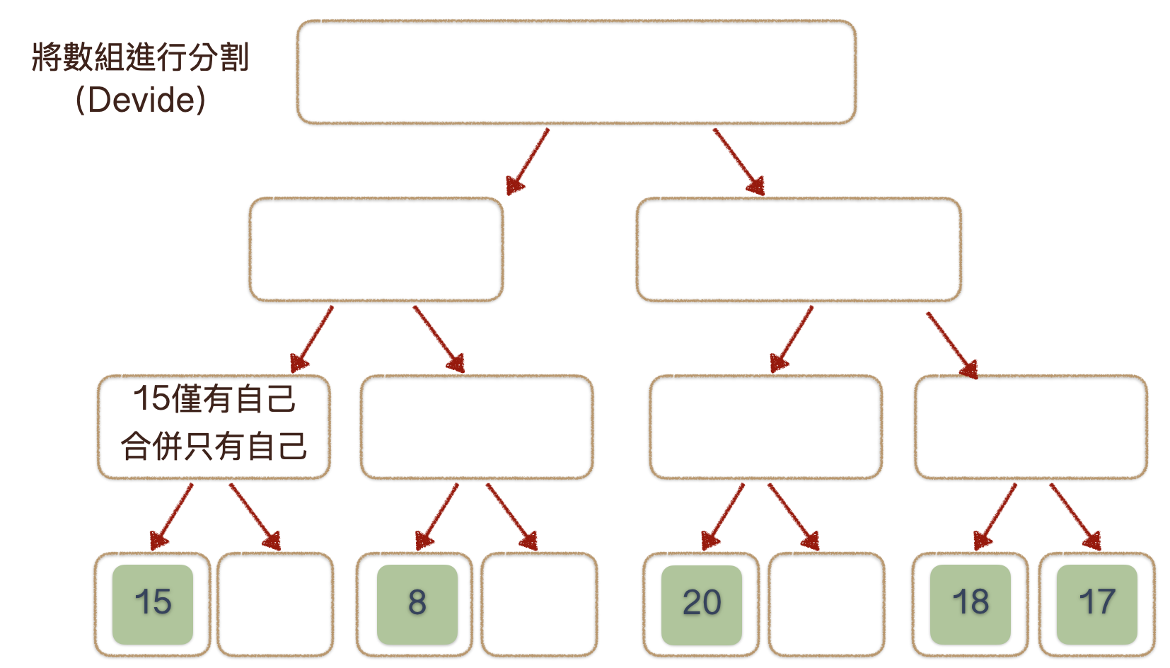 - 先將預排序數怎進行分割, 直到分割至最小單位後再逐一合併