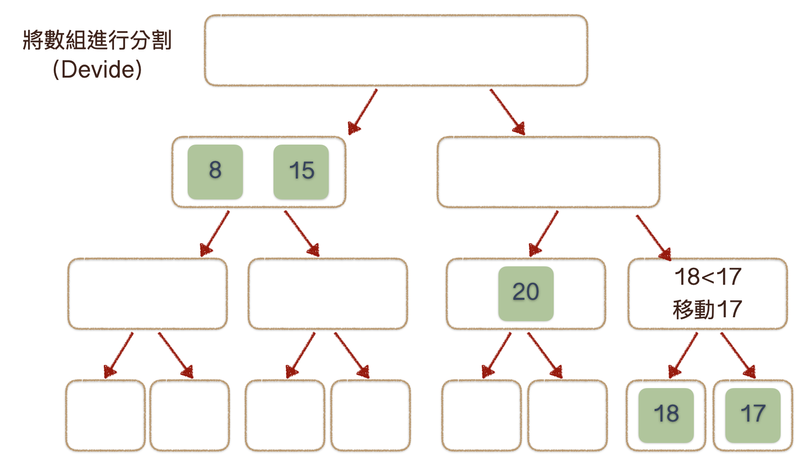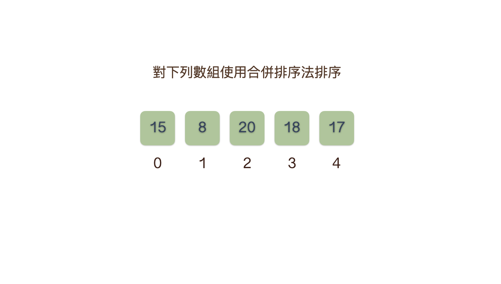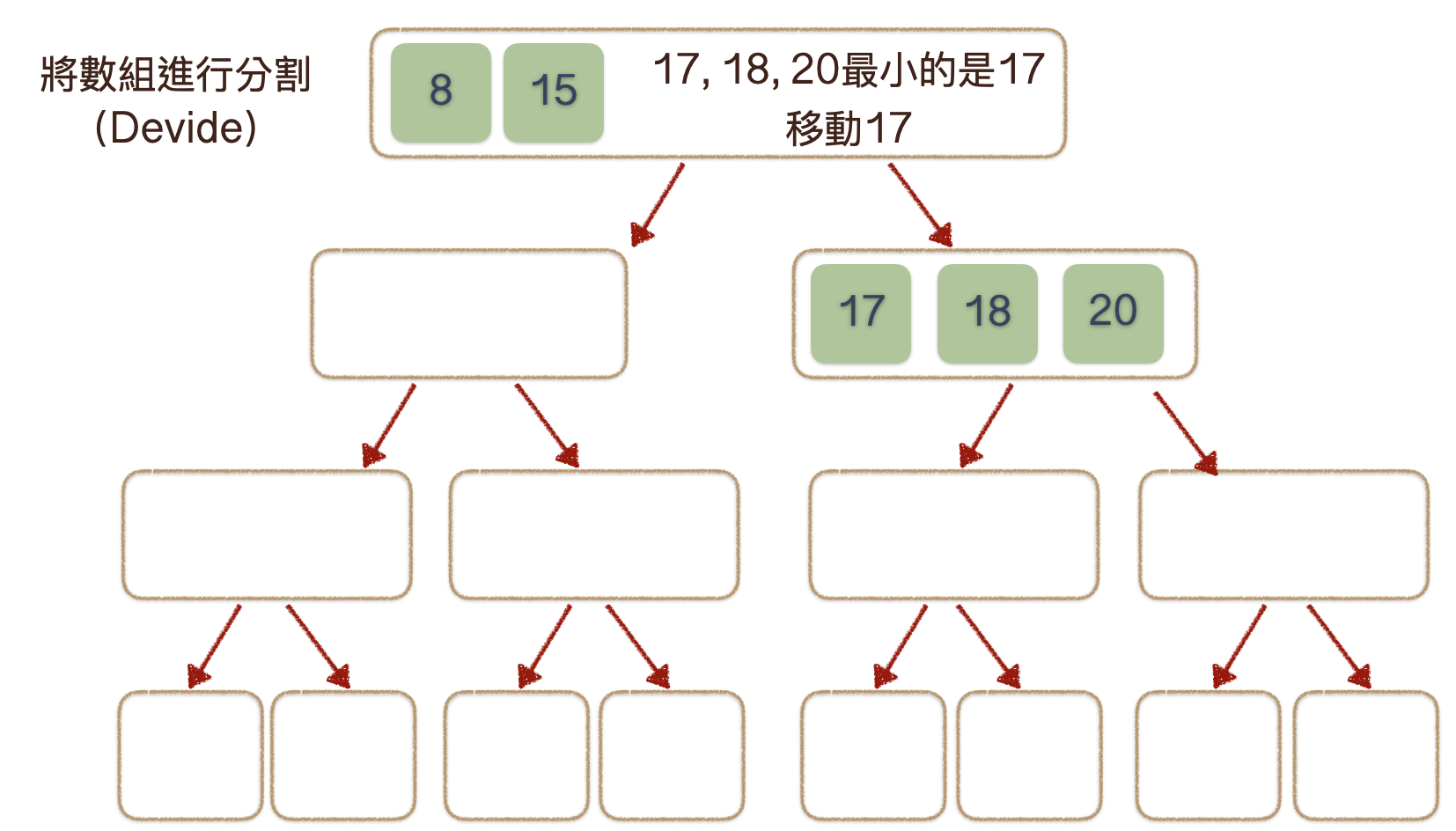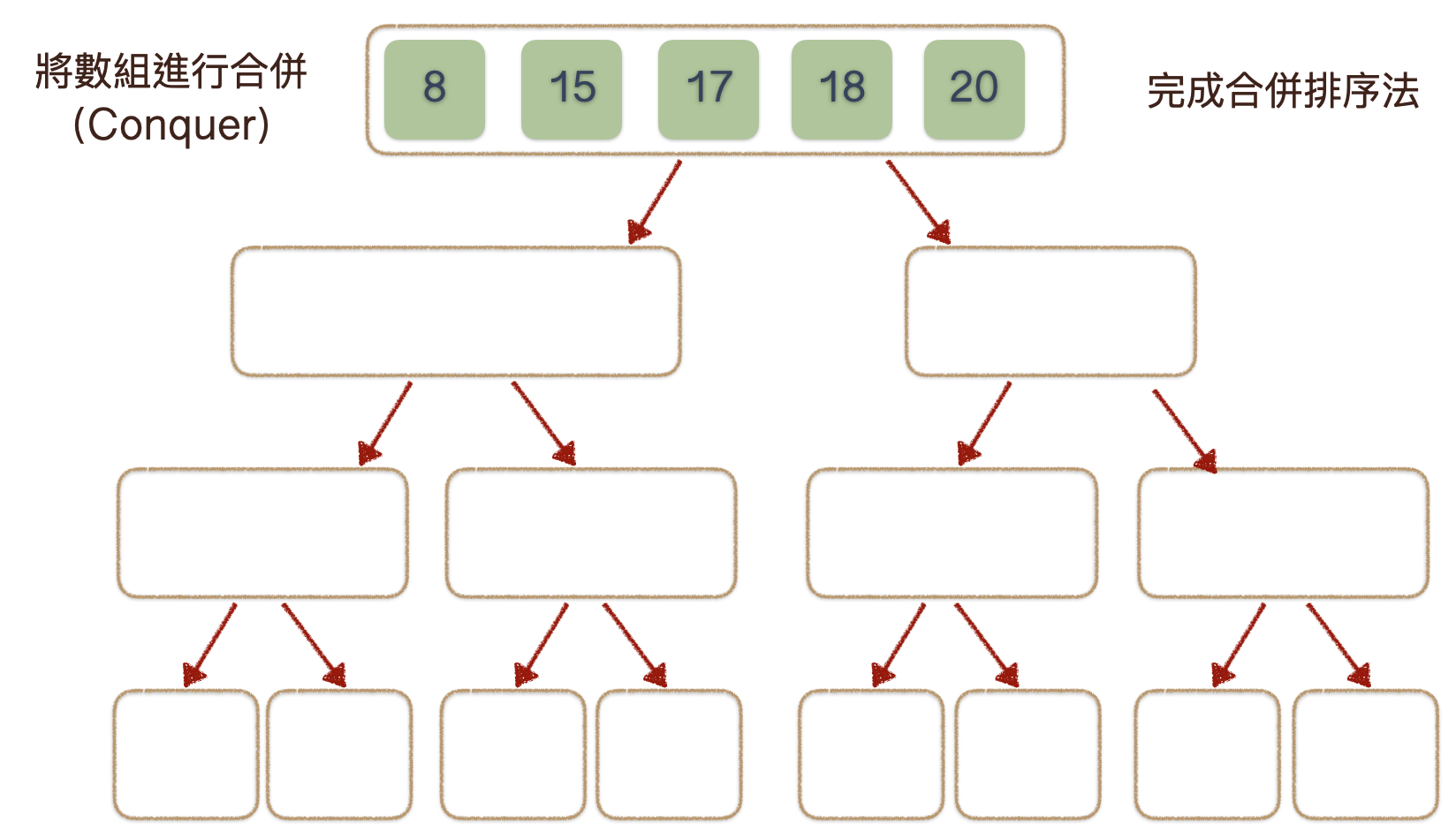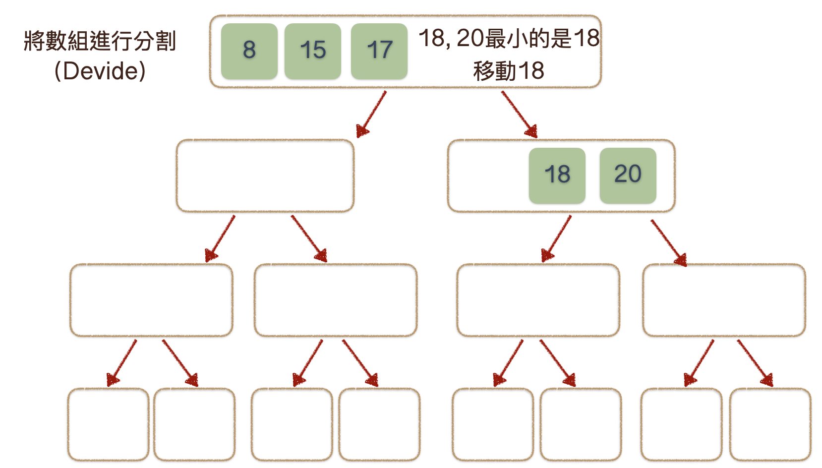 - 先將預排序數怎進行分割, 直到分割至最小單位後再逐一合併