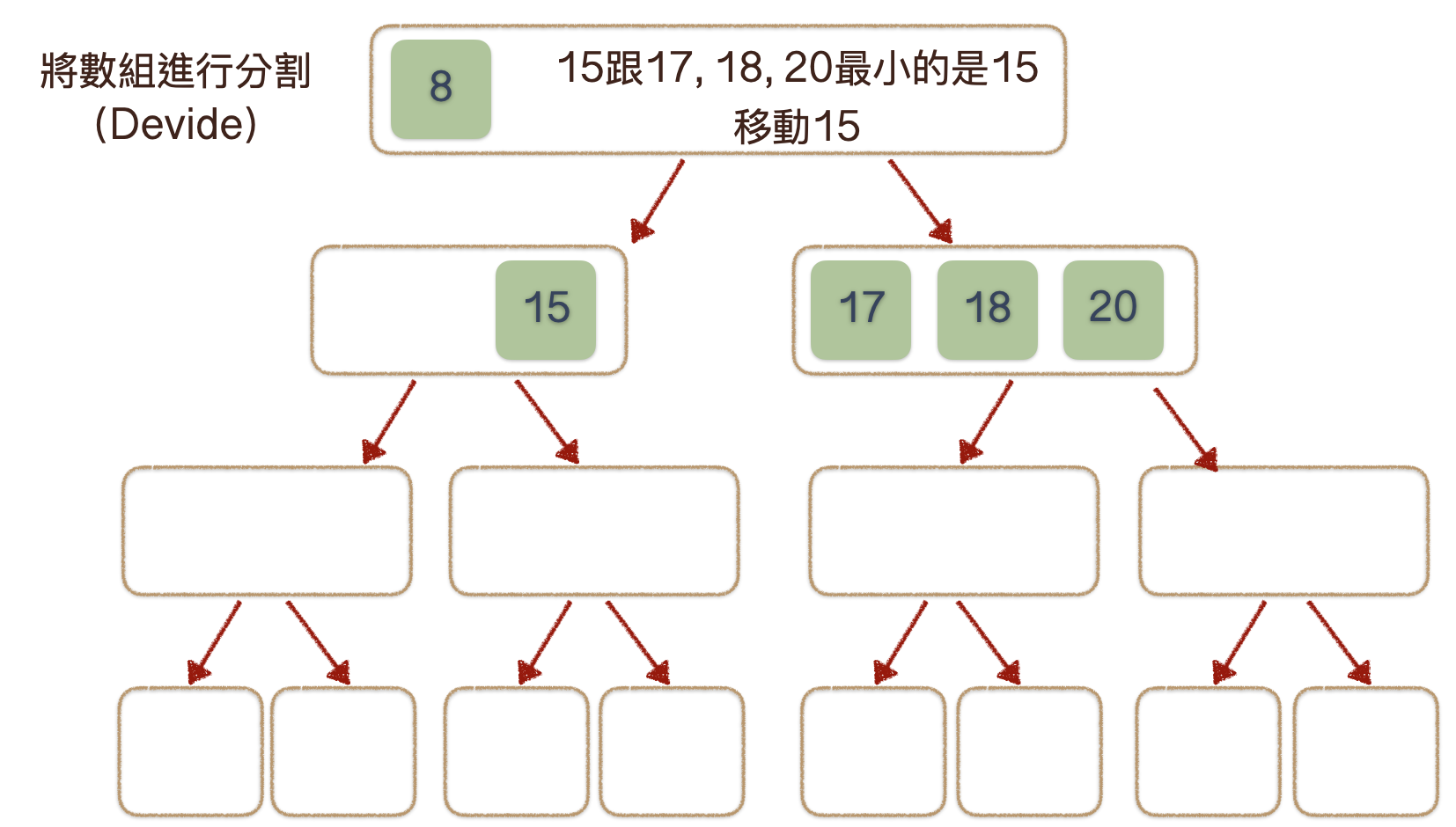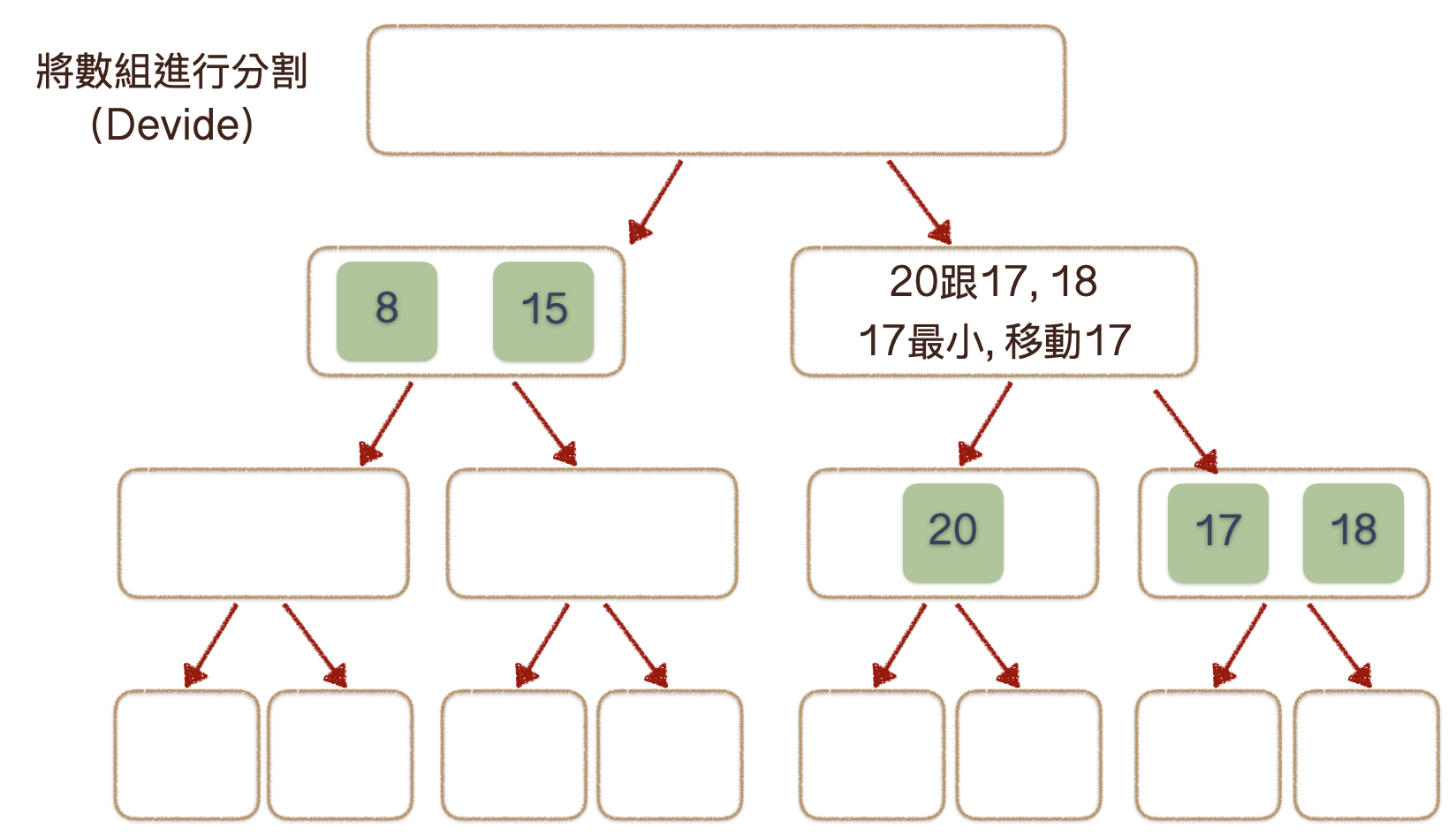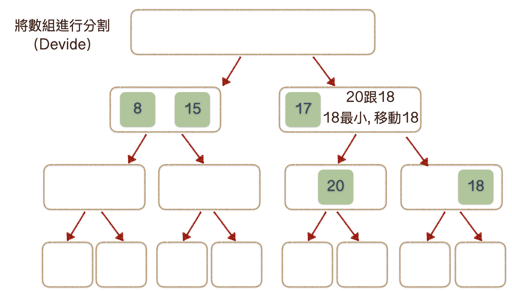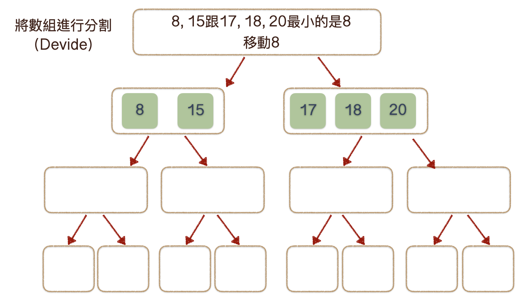 - 先將預排序數怎進行分割, 直到分割至最小單位後再逐一合併