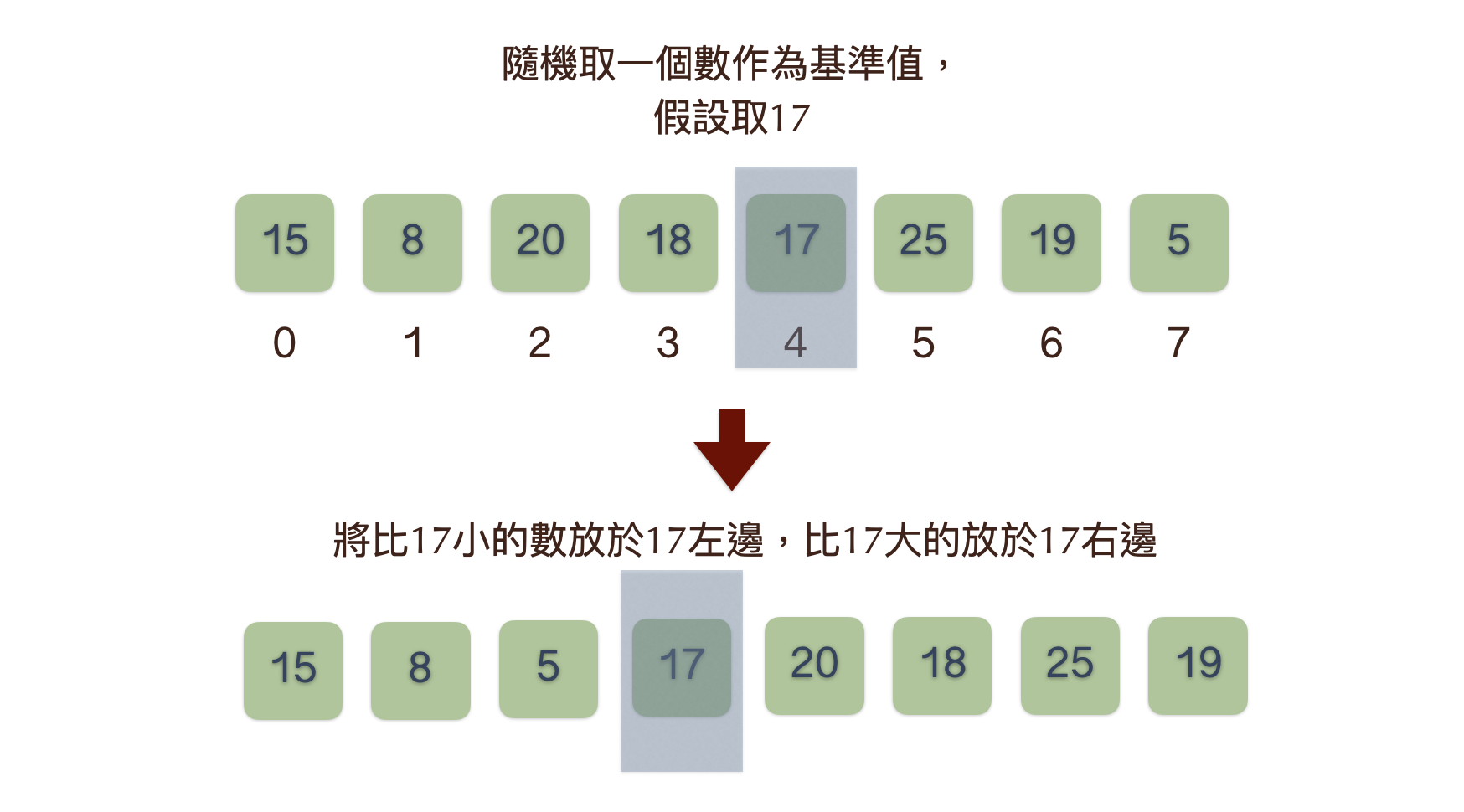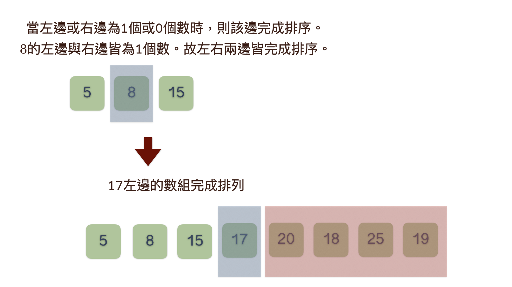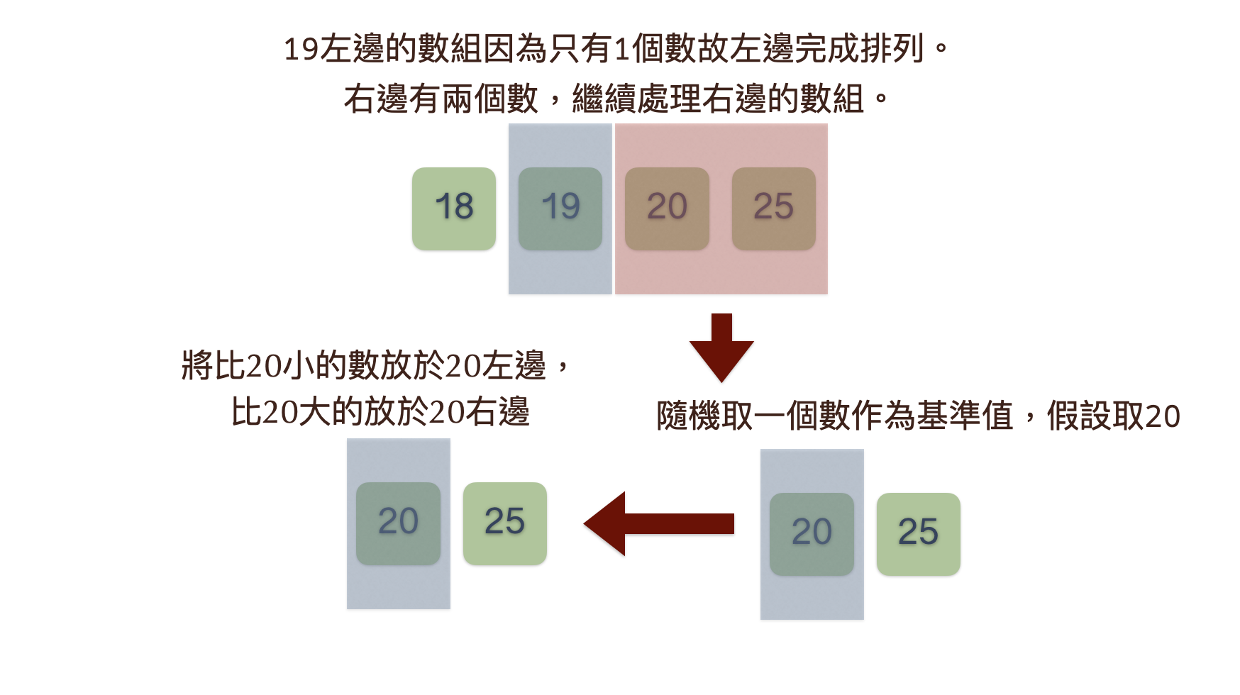 :將比基準值小的數放基準值左邊、比基準值大的放基準值右邊。當基準值左邊或右邊為1個或0個數時,則該邊完成排序。