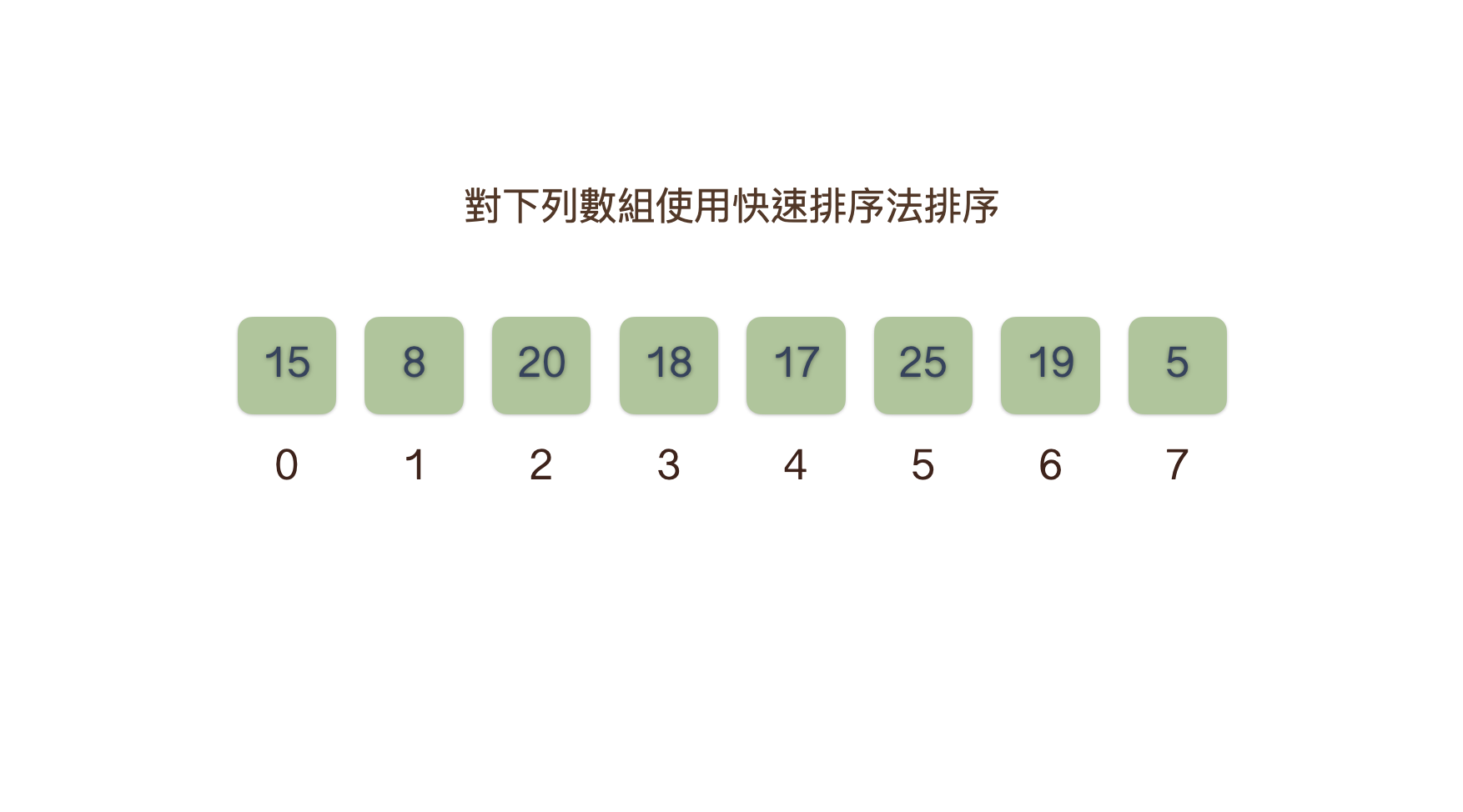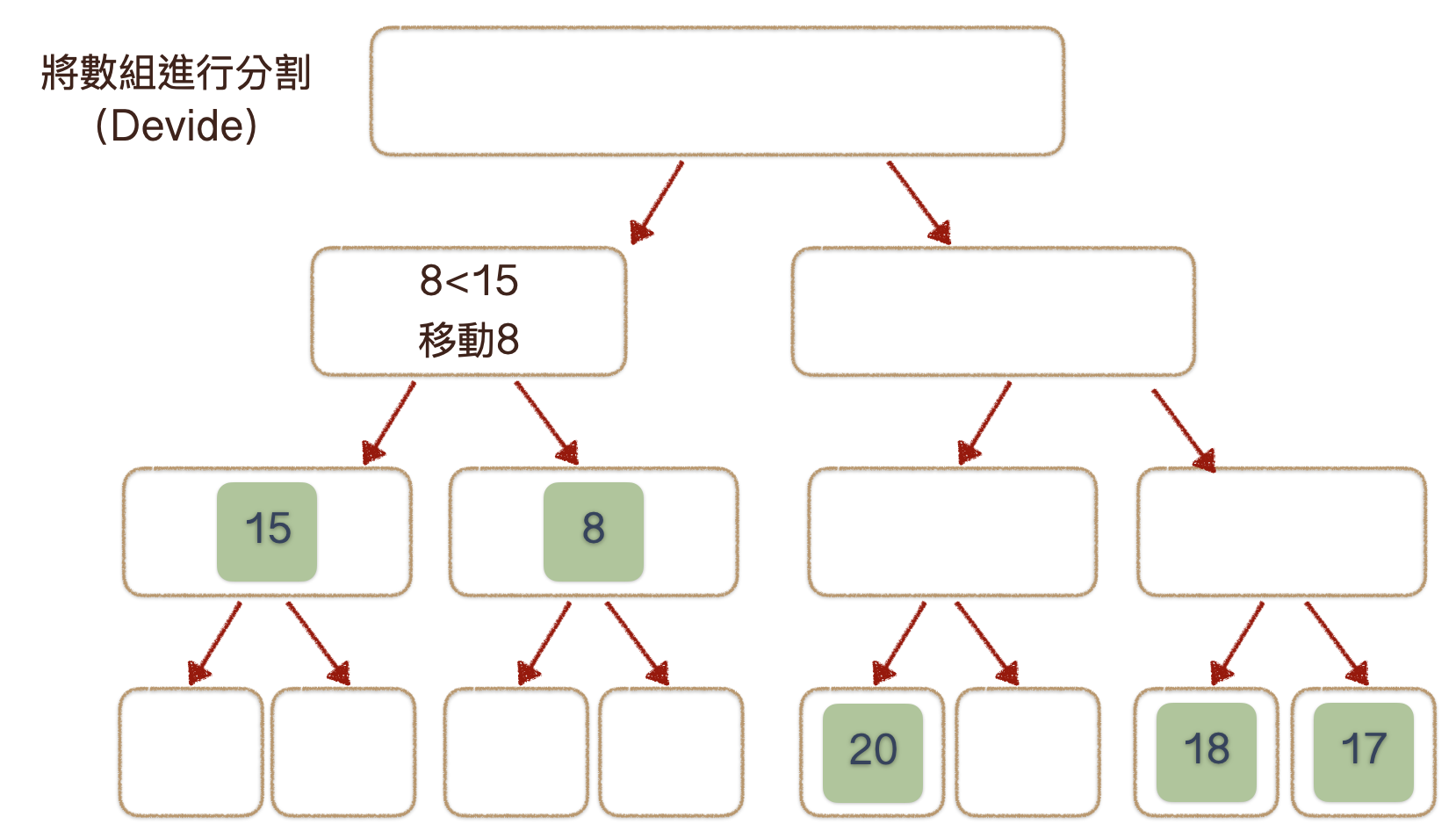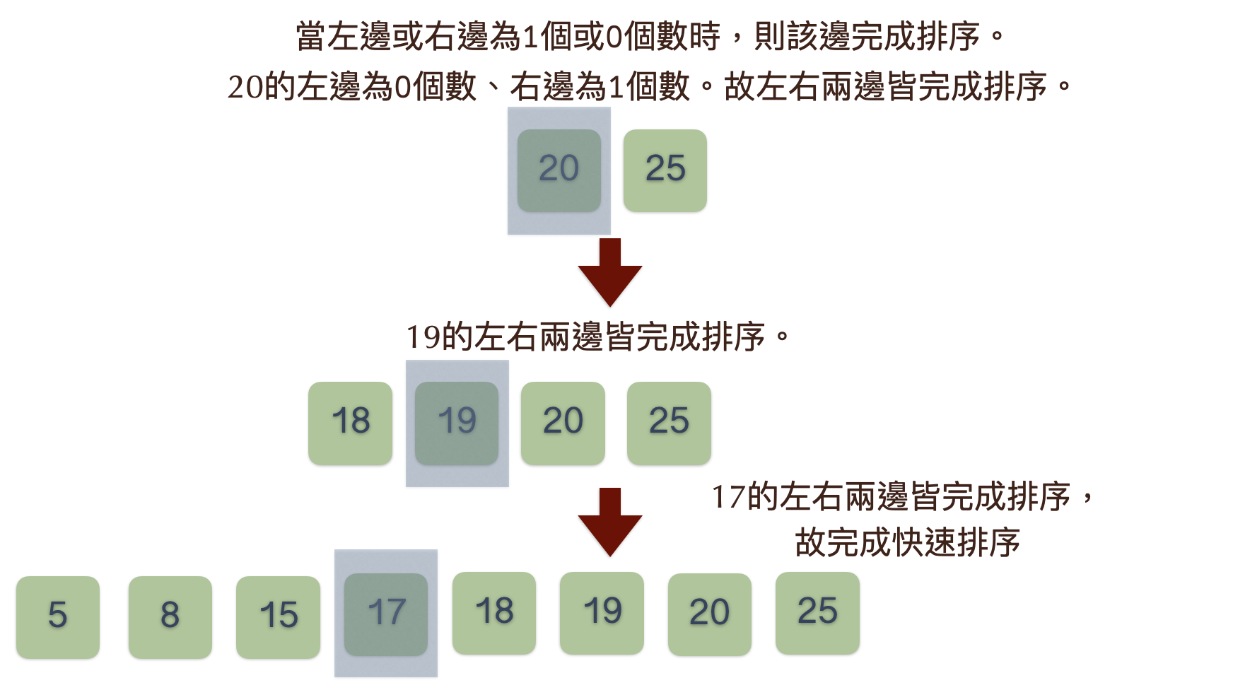 :將比基準值小的數放基準值左邊、比基準值大的放基準值右邊。當基準值左邊或右邊為1個或0個數時,則該邊完成排序。