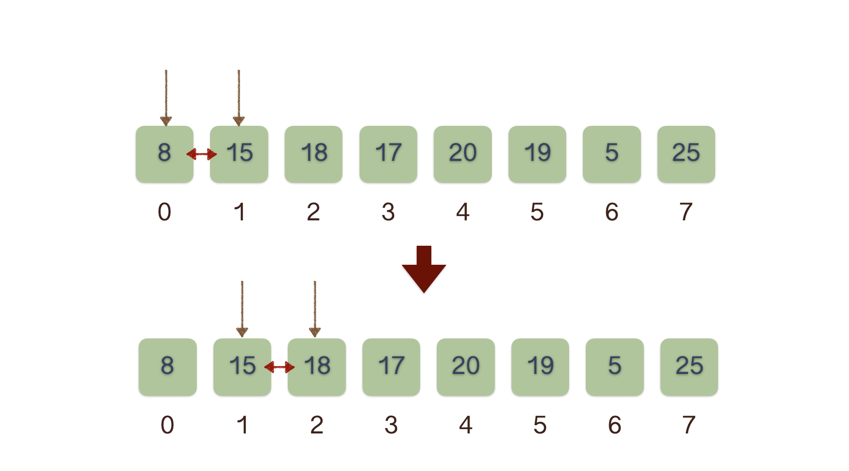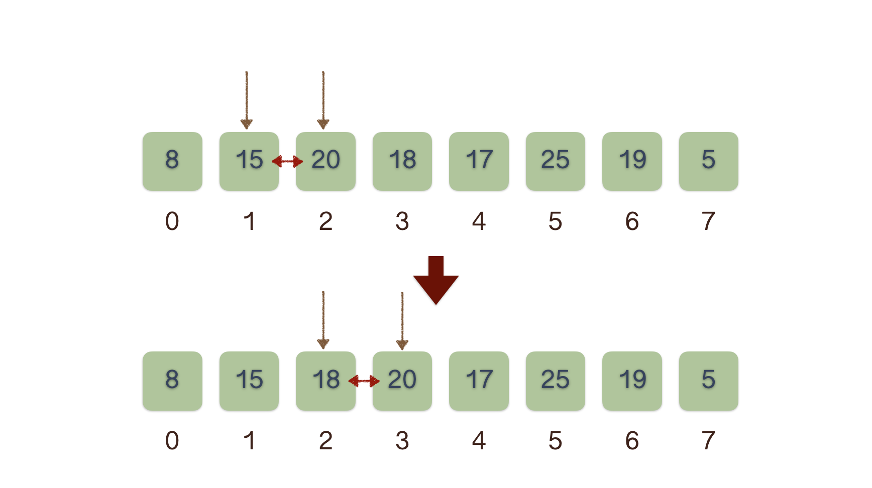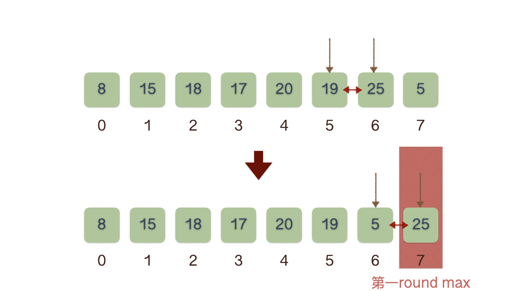- 與相鄰的元素比較, 若前一個元素大於後一個元素則交換