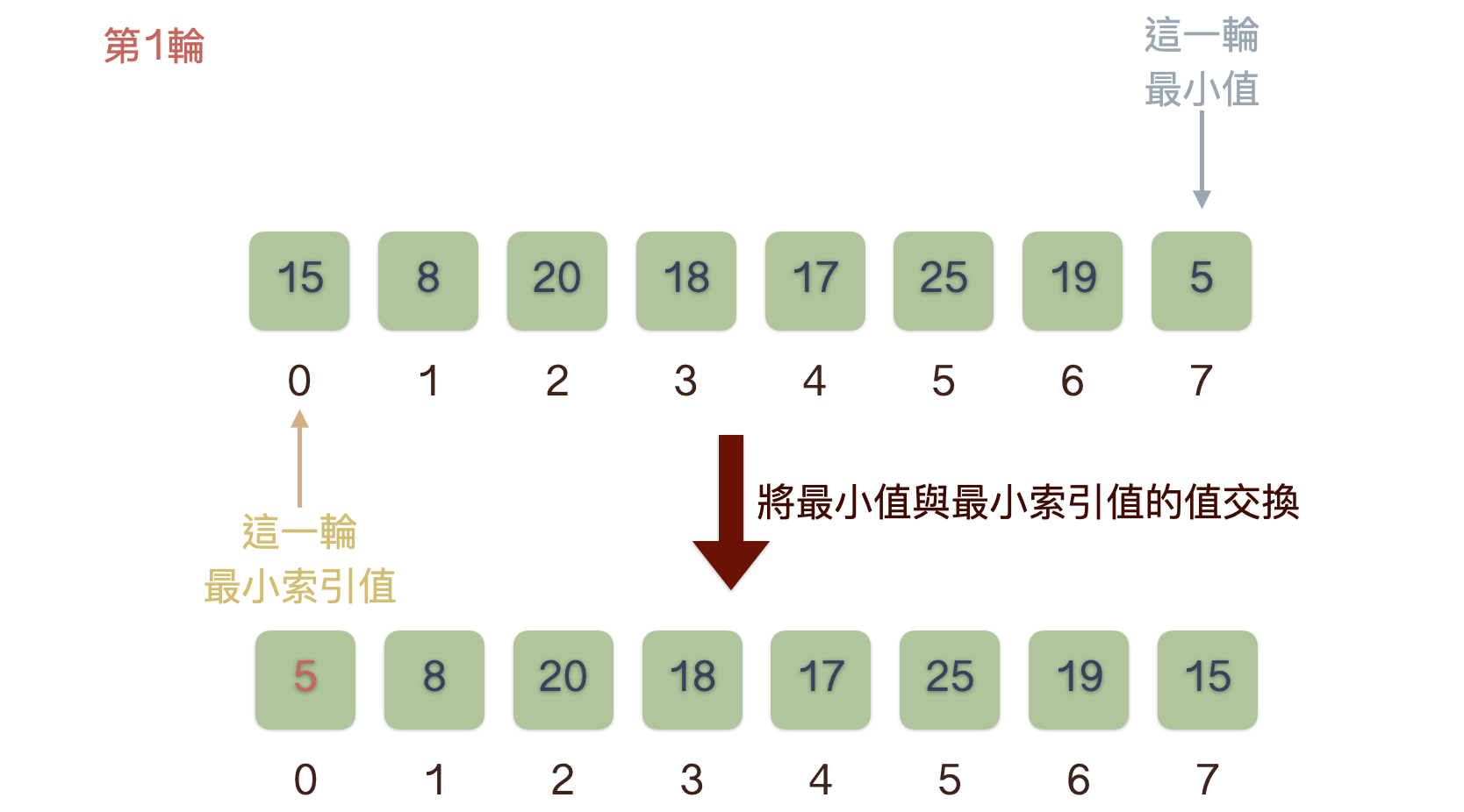 - 每一輪都找出最小值, 並將最小值與尚未交換的最小索引值的值交換