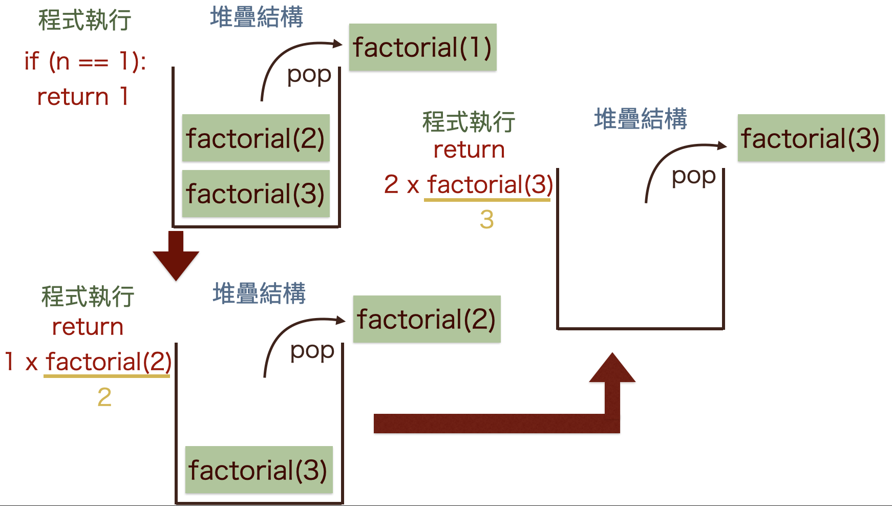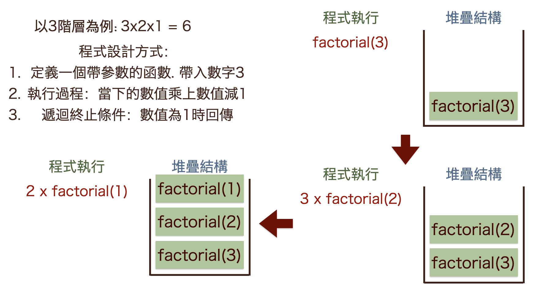 圖例 - 用堆疊看遞迴(階層為例)¶