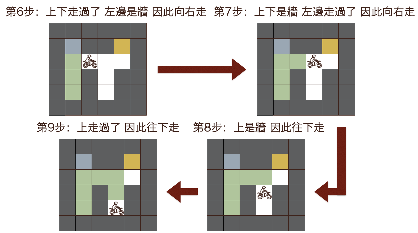 若上下左右有可以走的, 並且無重複走過. 則往該方向走