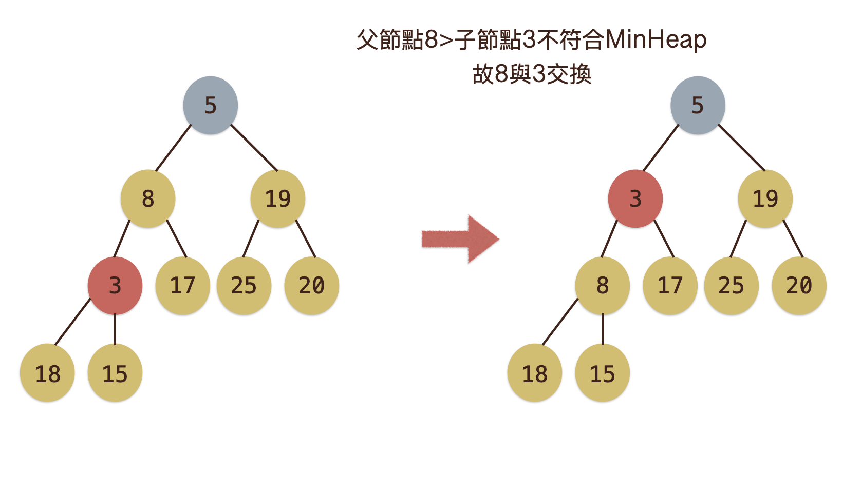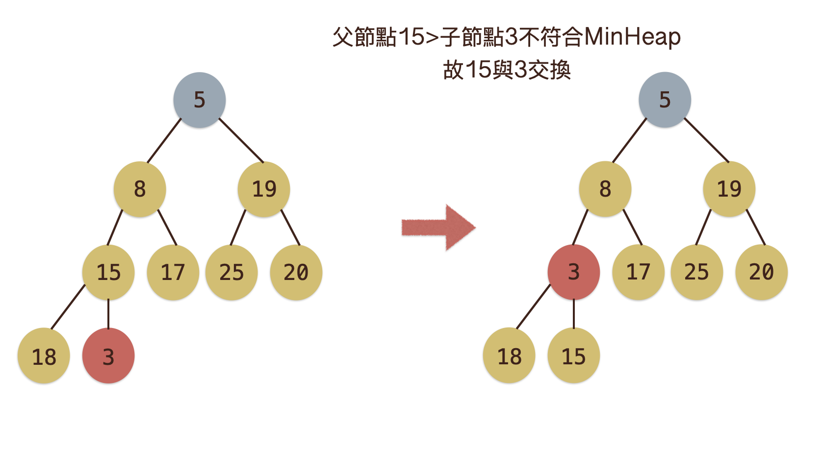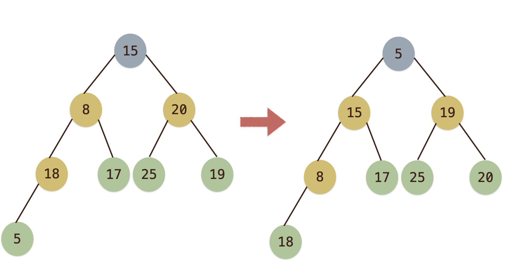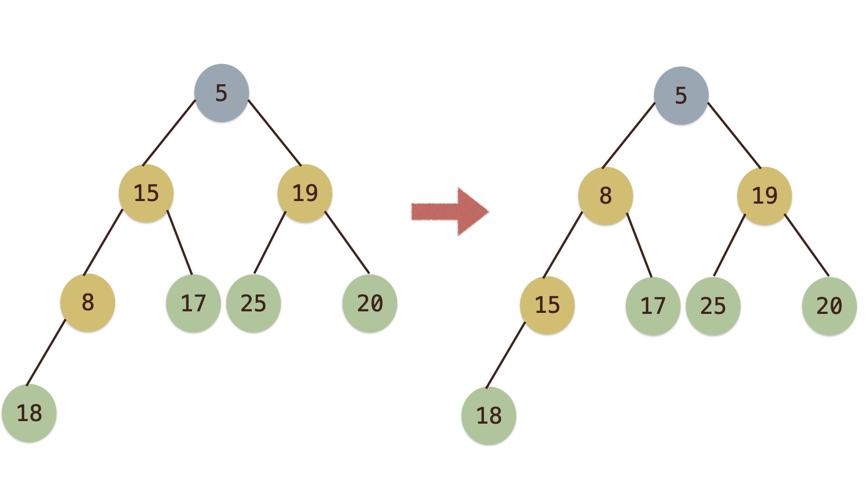 由下而上, 從有子節點的父節點開始逐一交換節點18