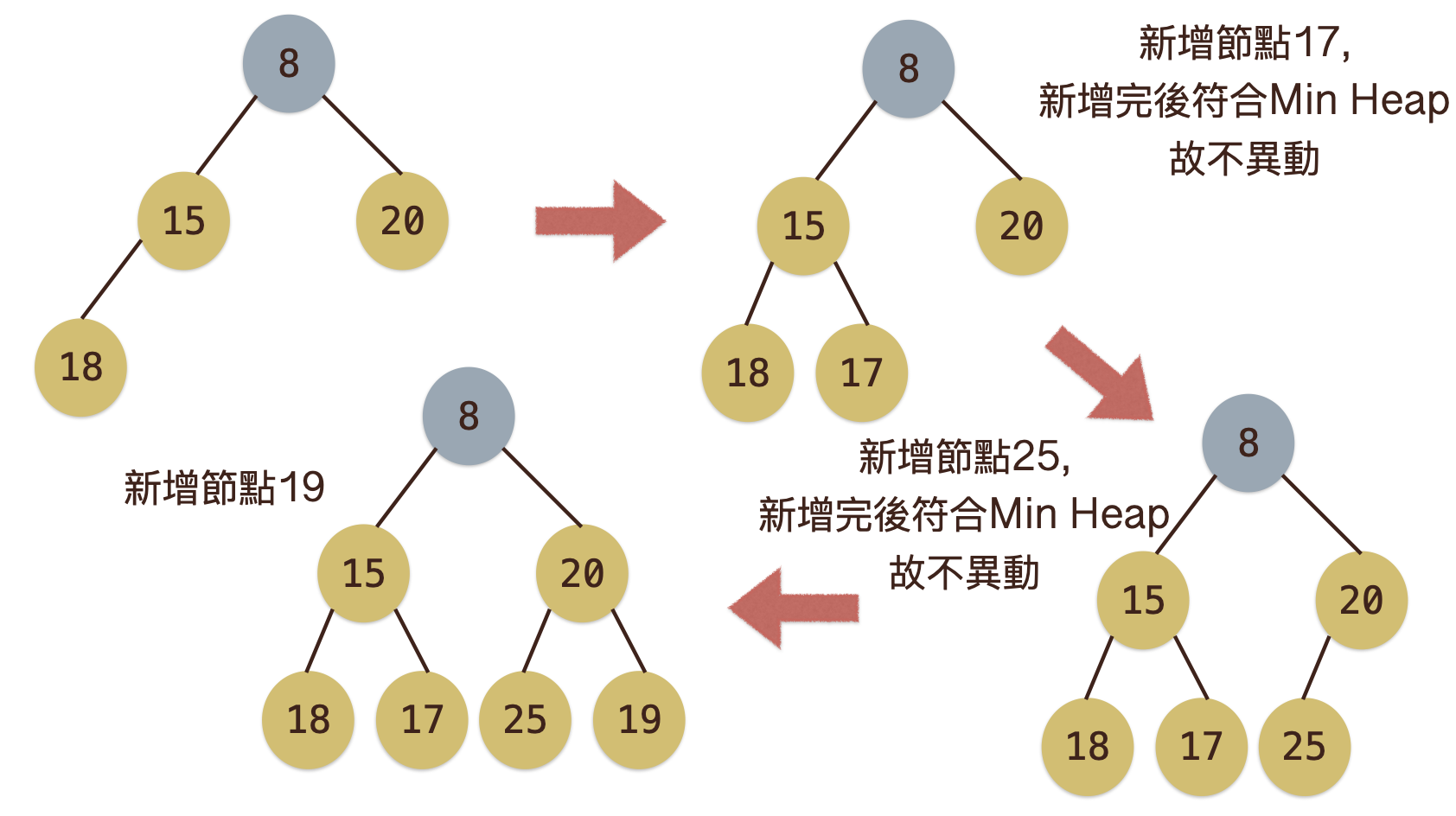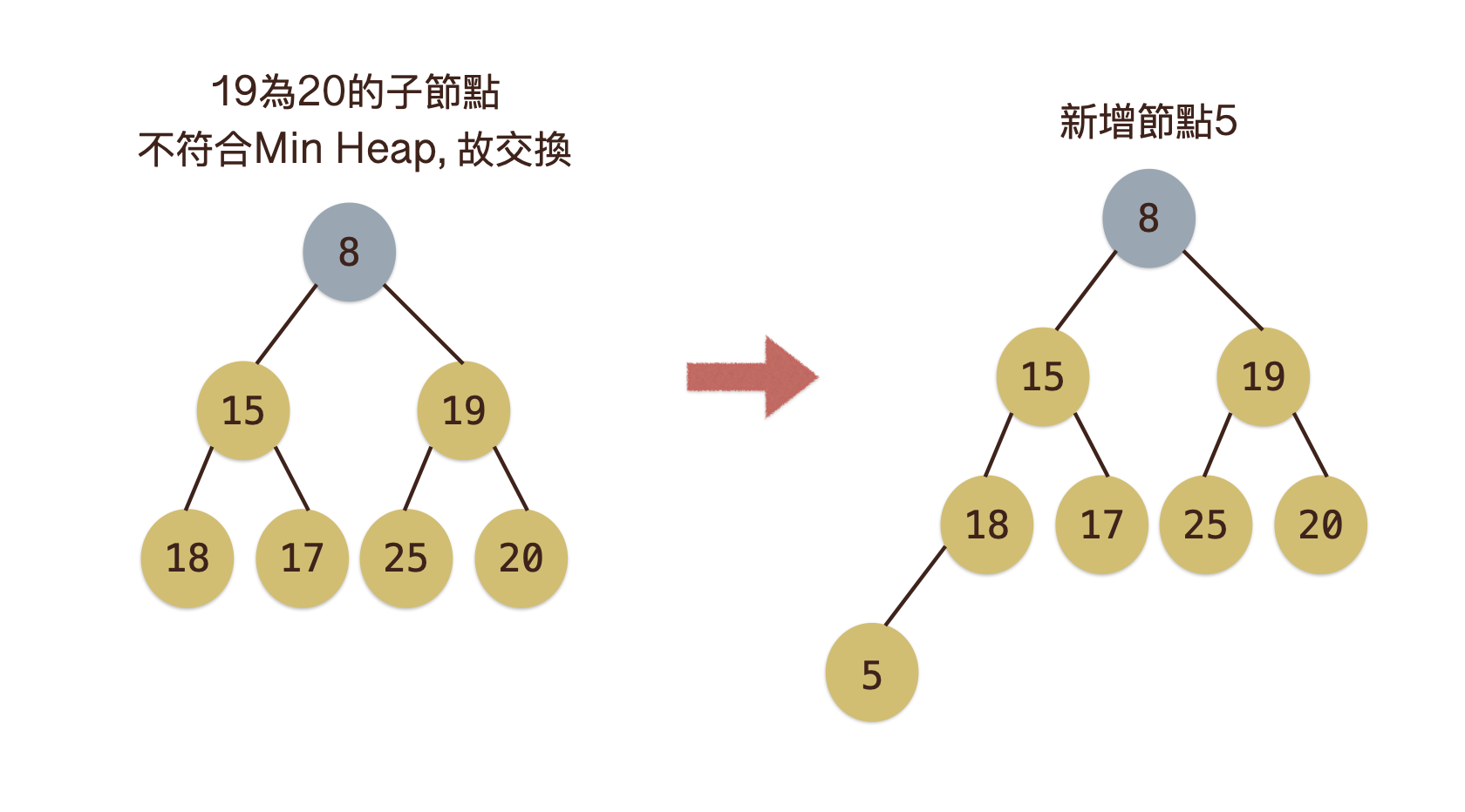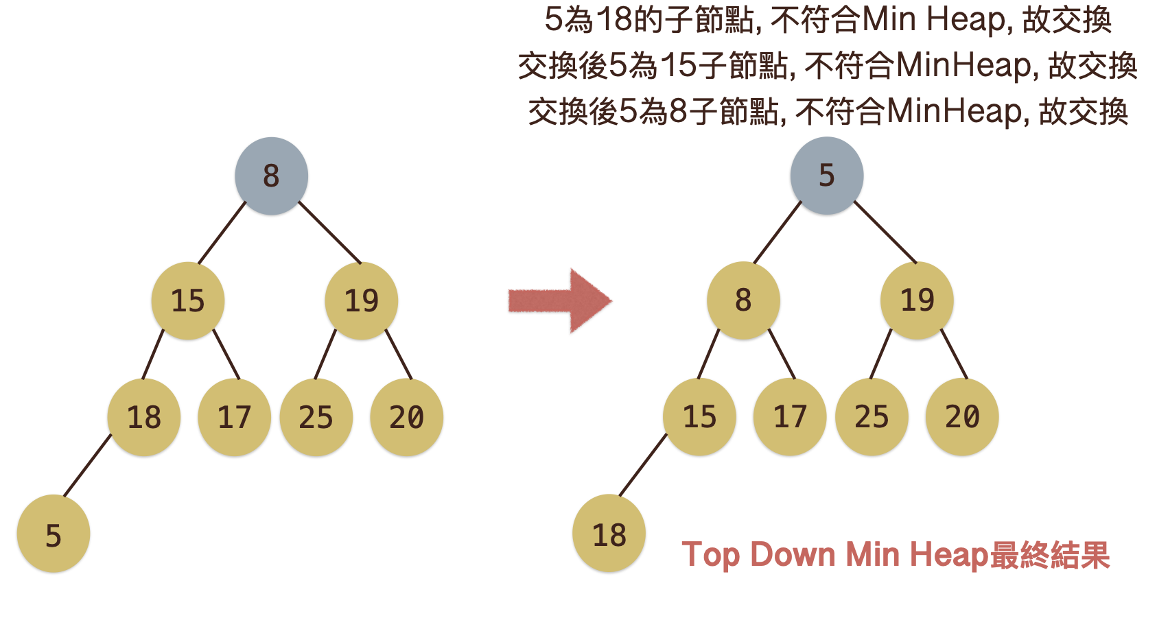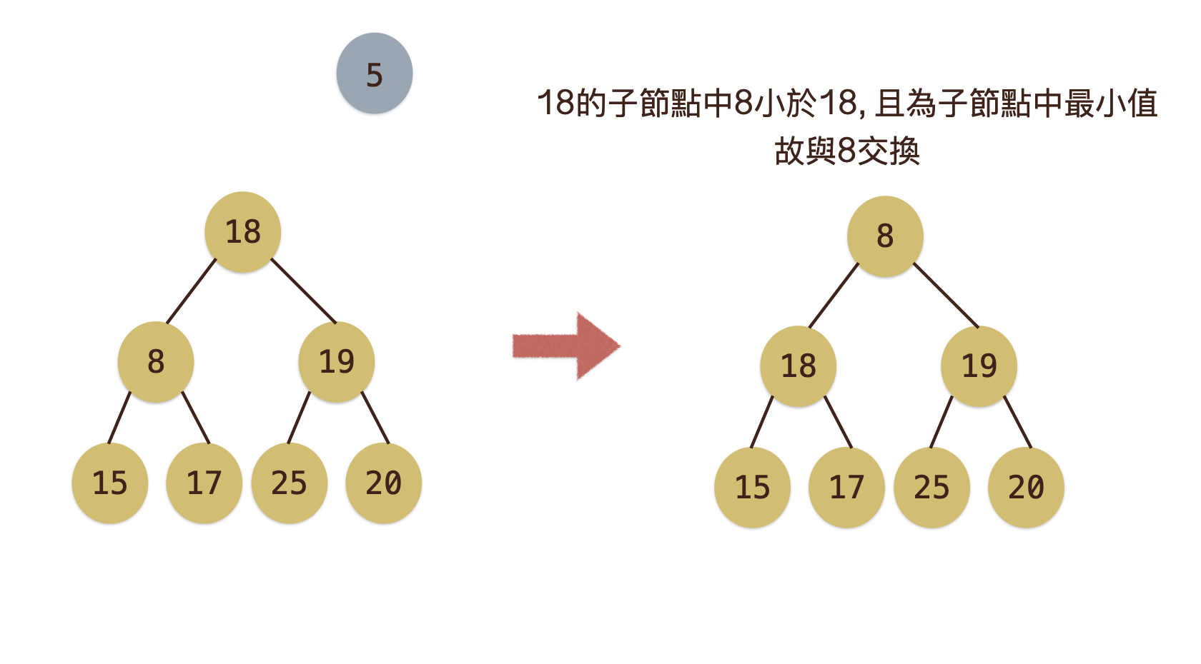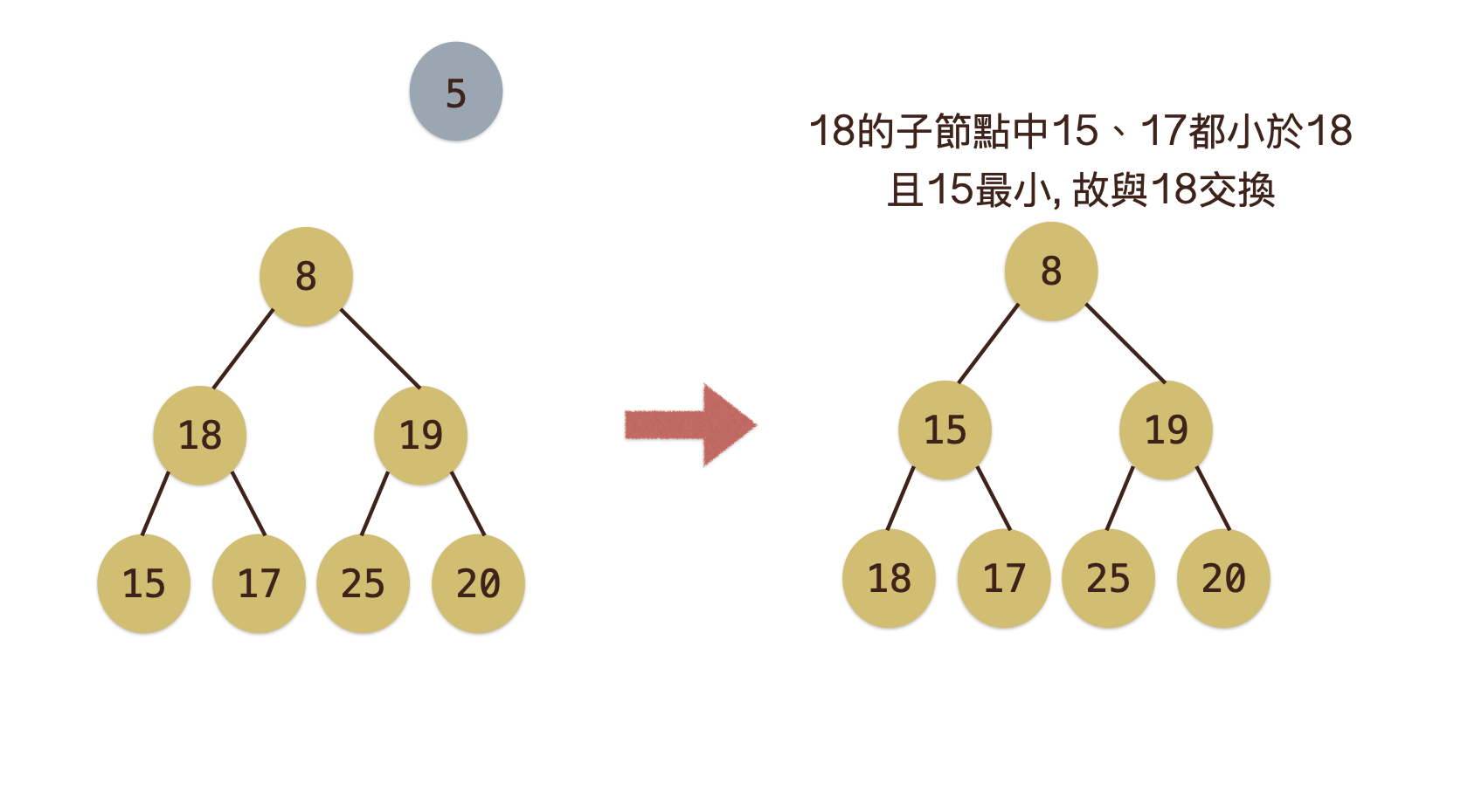 Original Data: [15, 8, 20, 18, 17, 25, 19, 5] Heap Tree中前4個最大的數 [25, 20, 19, 18] Heap Tree中前4個最小的數 [5, 8, 15, 17]