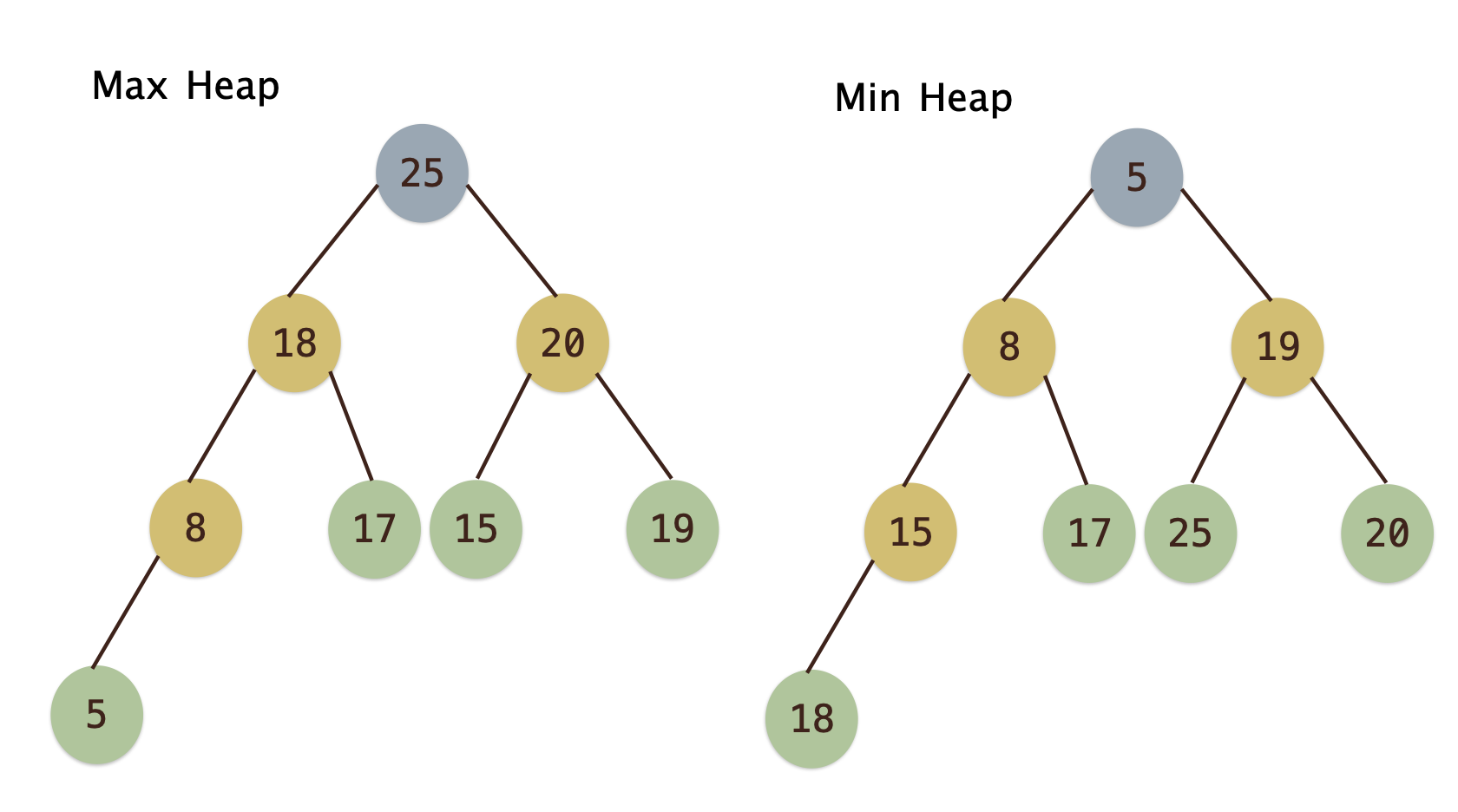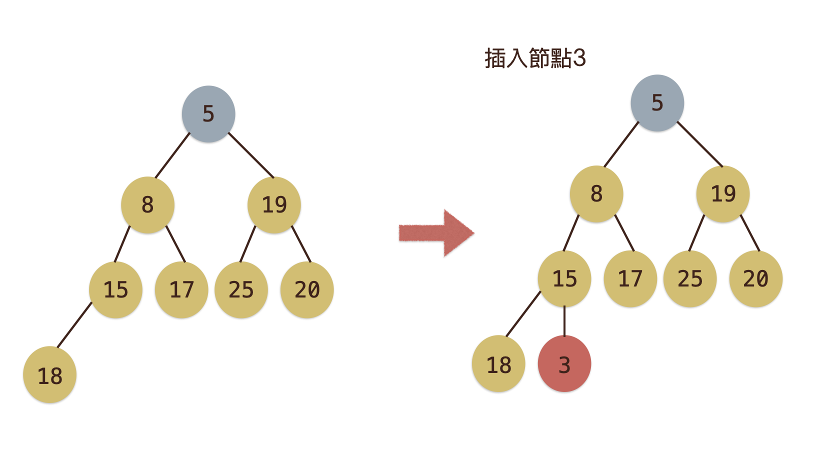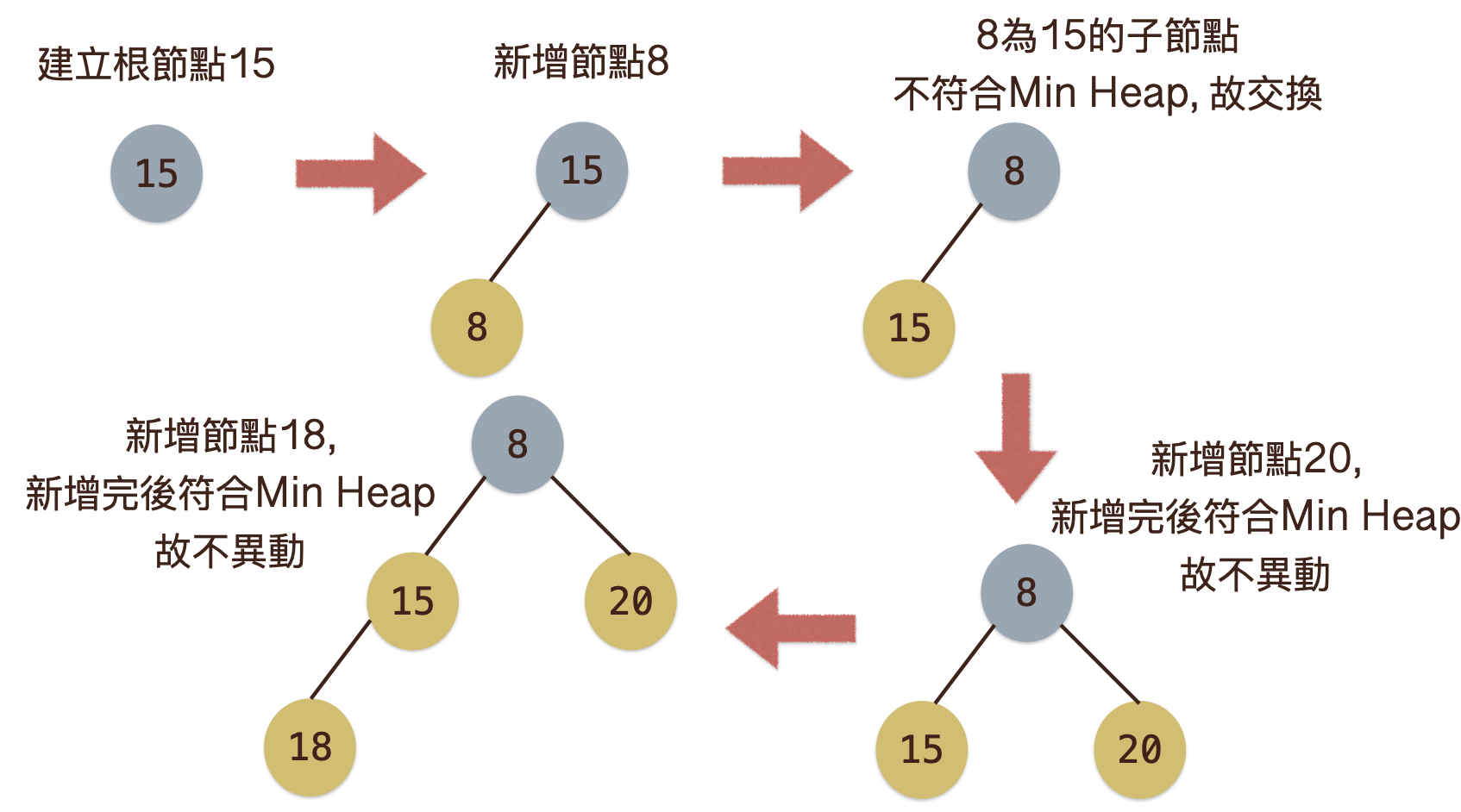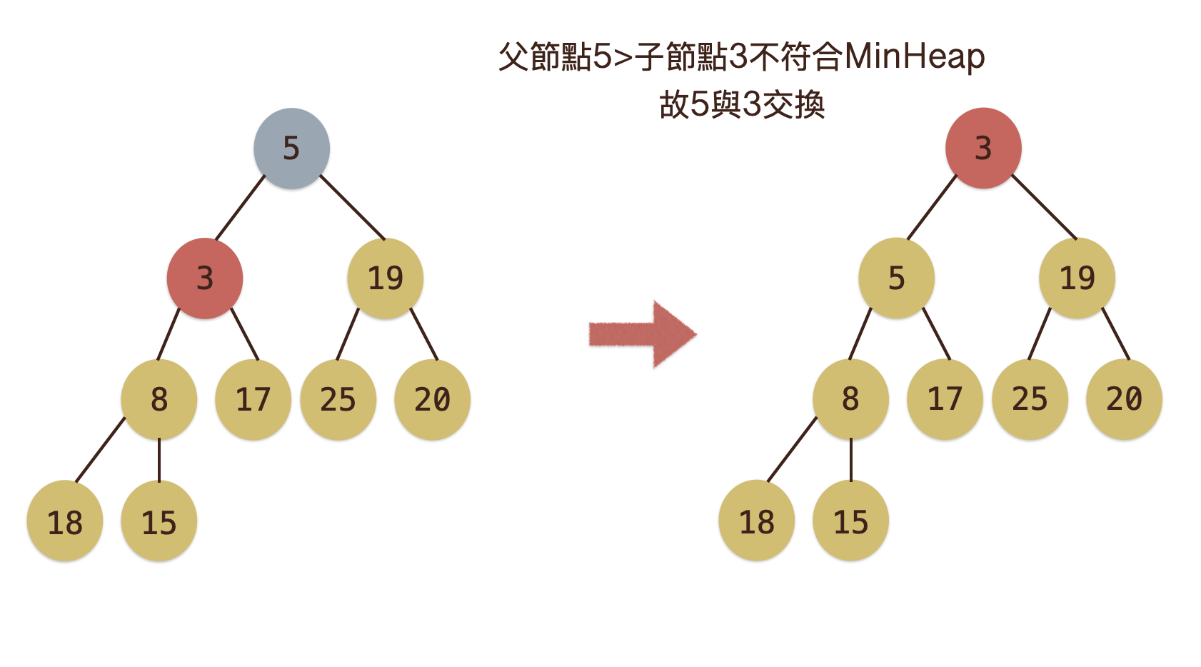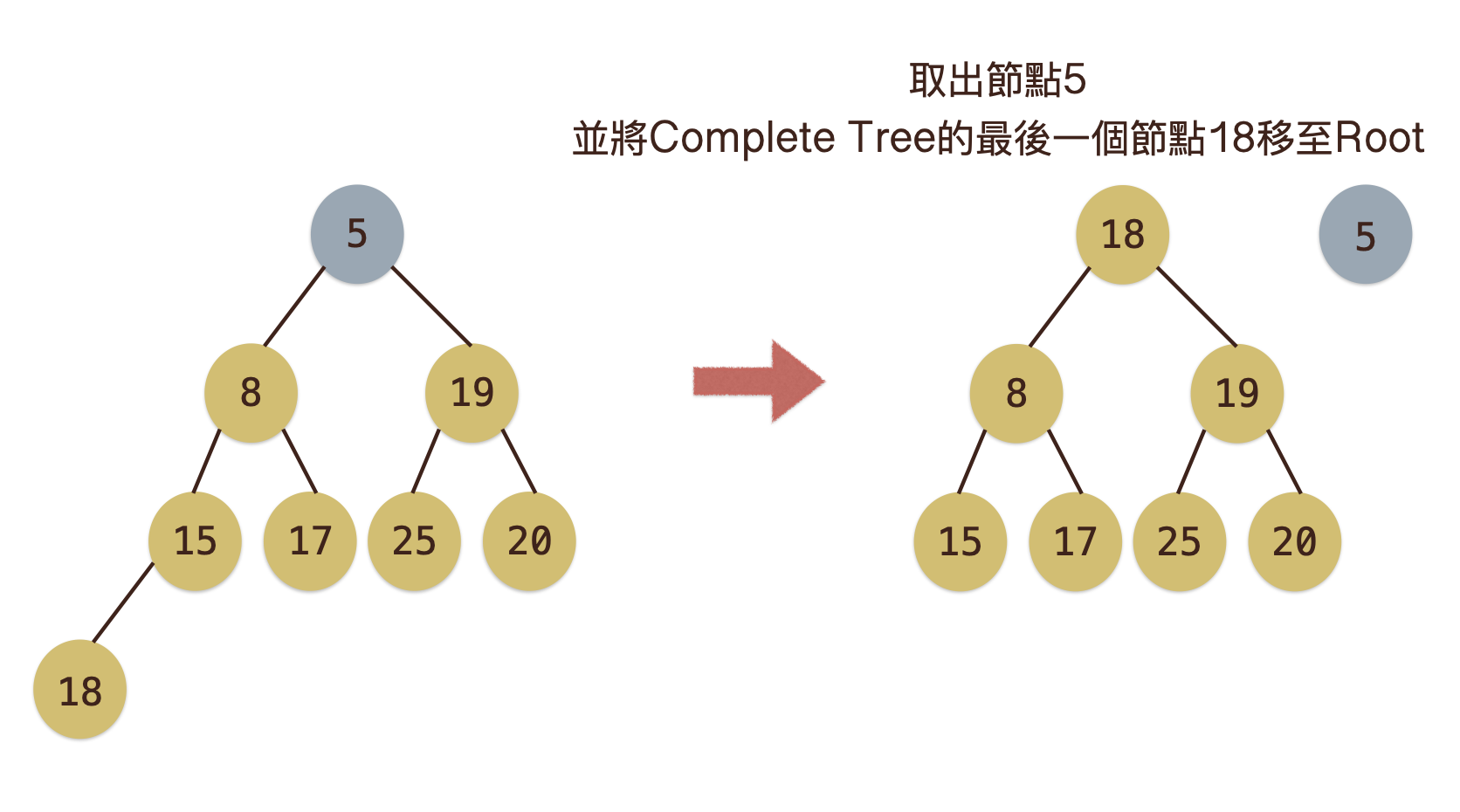 Original Data: [15, 8, 20, 18, 17, 25, 19, 5] Heap Tree中前4個最大的數 [25, 20, 19, 18] Heap Tree中前4個最小的數 [5, 8, 15, 17]
